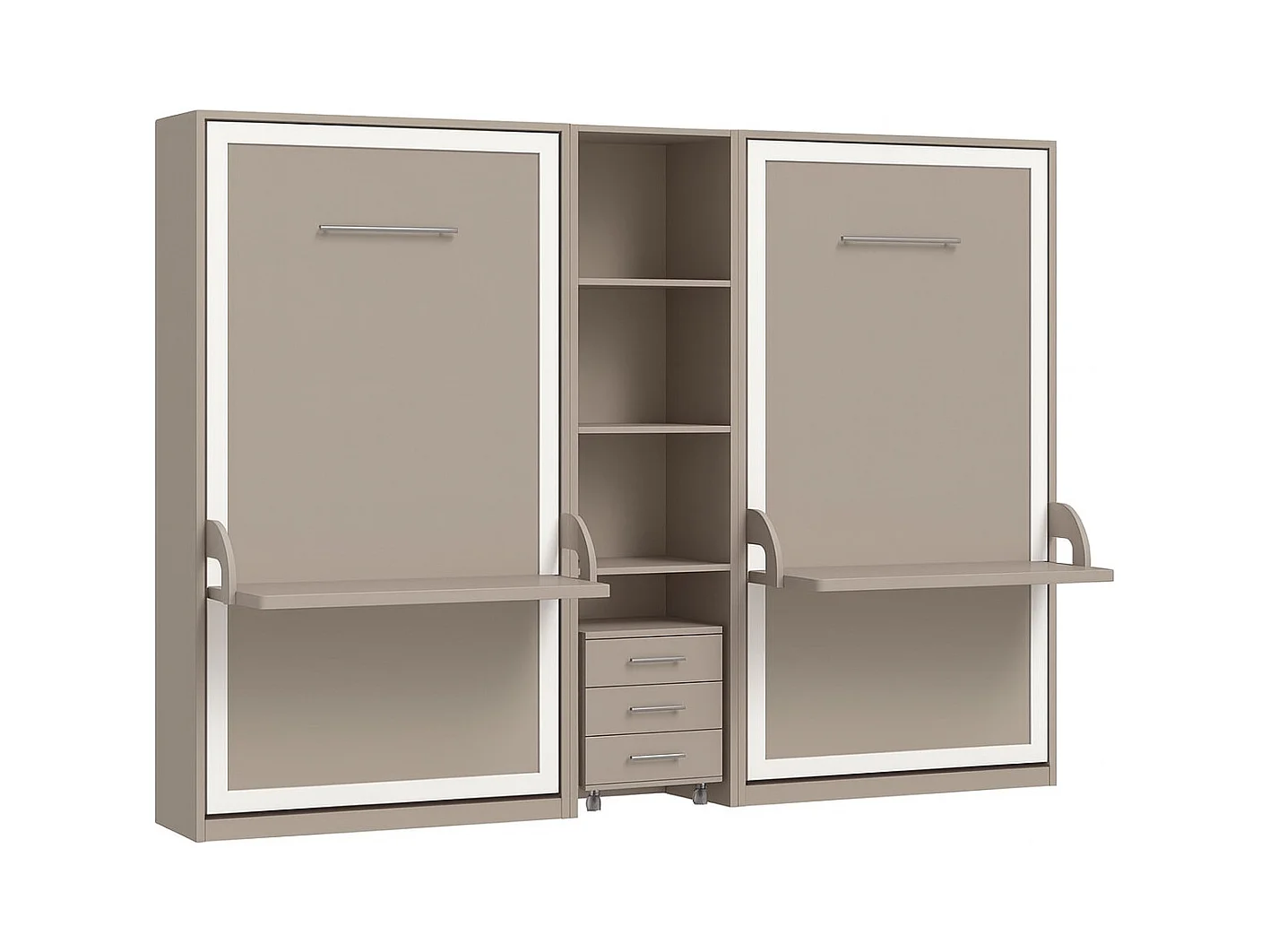 2 camas retráctiles de 90x190 con escritorio y estantería central Studante-Frente Topo
