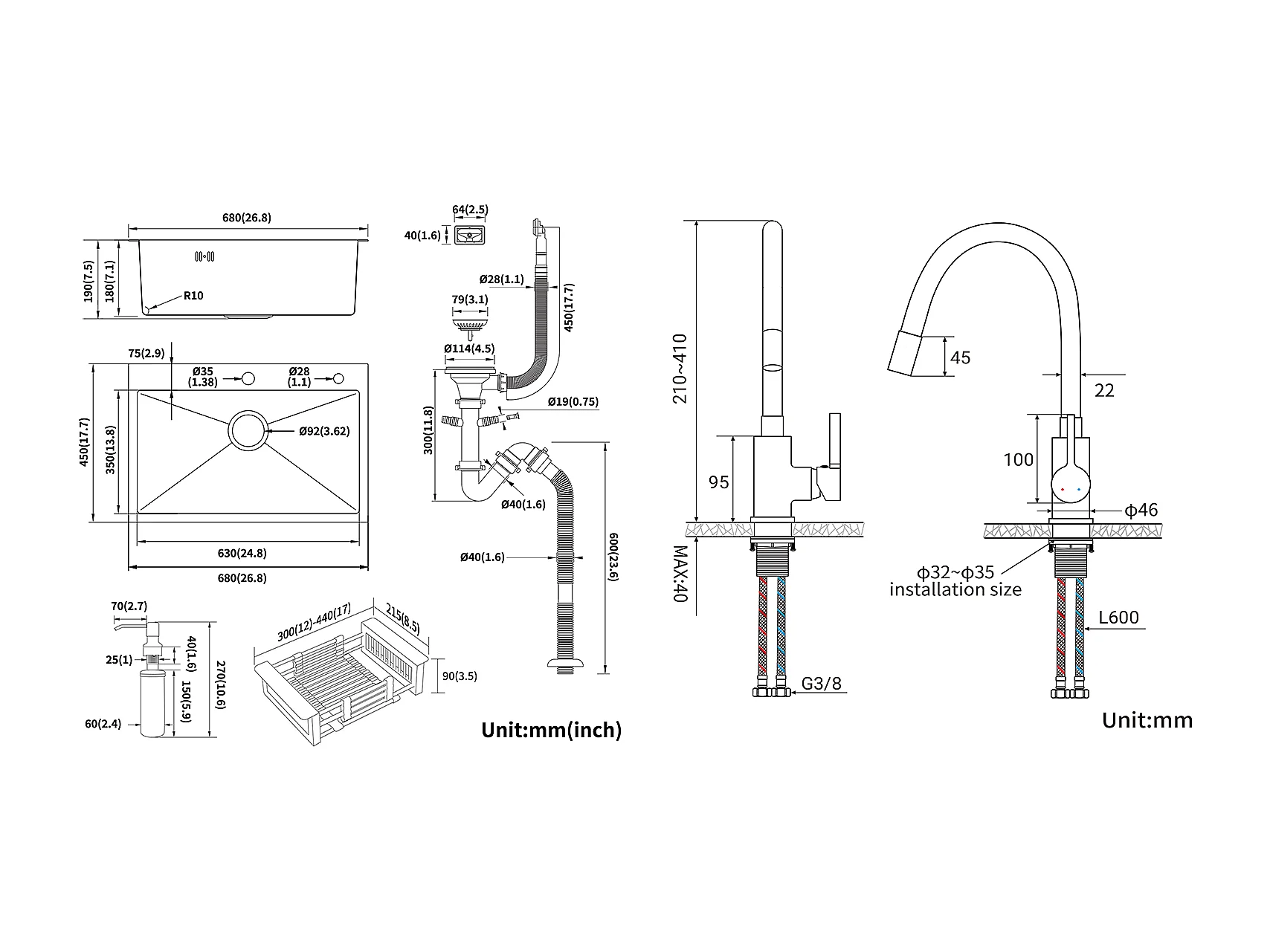 2 en 1 Fregadero de Cocina Negro 68x45x19CM con Distributor de Jabón y Escurridor Cesta+GrifoDe Cocina Flexible Cec Alto Orientable