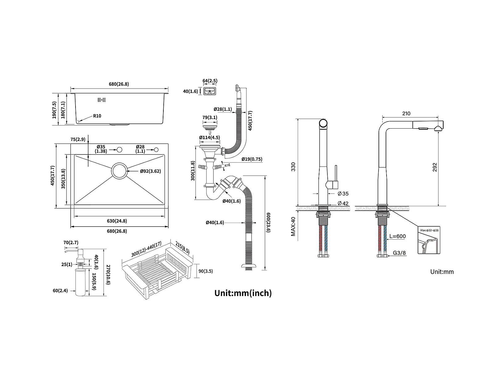 Fregadero Cocina 1 Bandeja 68*45*19CM INOX Demasiado Lleno Fregadero Empotrable, con Distributor Jabón y Escurridor Cesta, Cepillado,Modelo UE