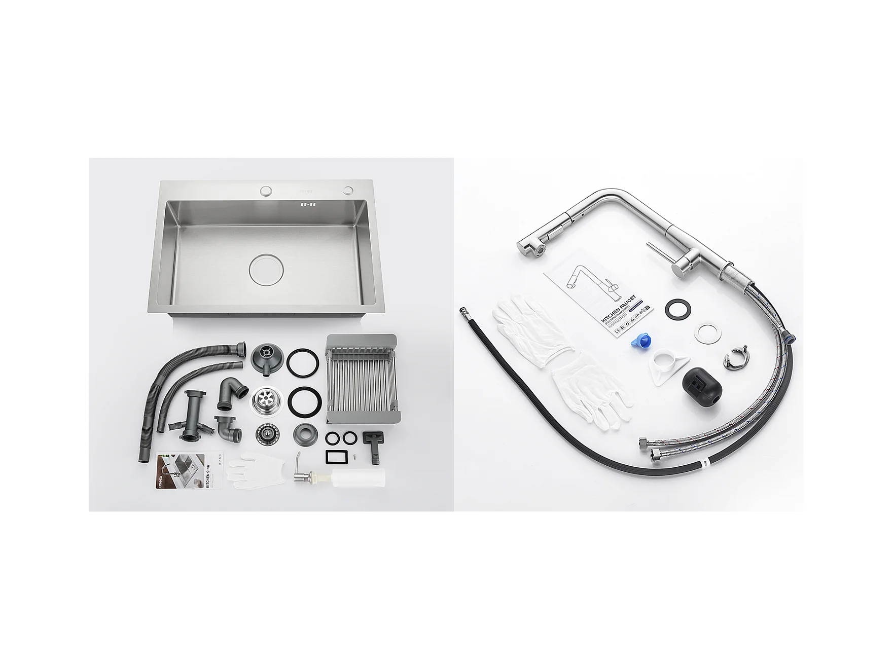 2 en1 Fregadero Cocina Cepillado 68x45x19CM con Distributor Jabón Escurridor Cesta+Grife Cocina Ducha Extragible Dos Jets Giratorio 360°