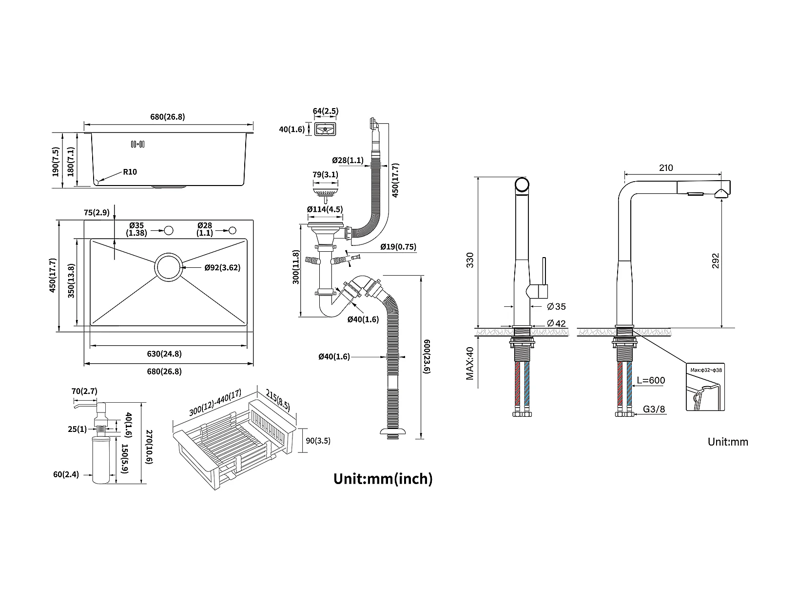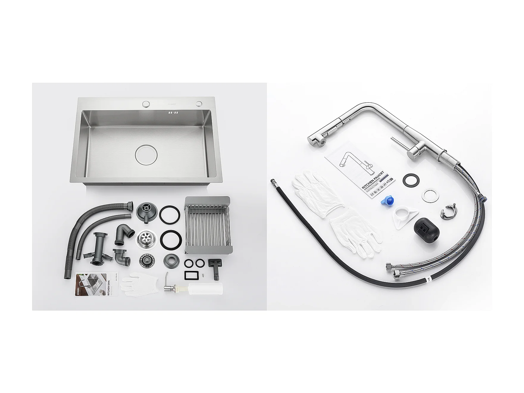 2en1 Fregadero Cocina Cepillado 68x45x19CM con Distributor Jabón Escurridor Cesta+Mezclador Cocina con Ducha Extraíble Giratoria 360°,Cepillado