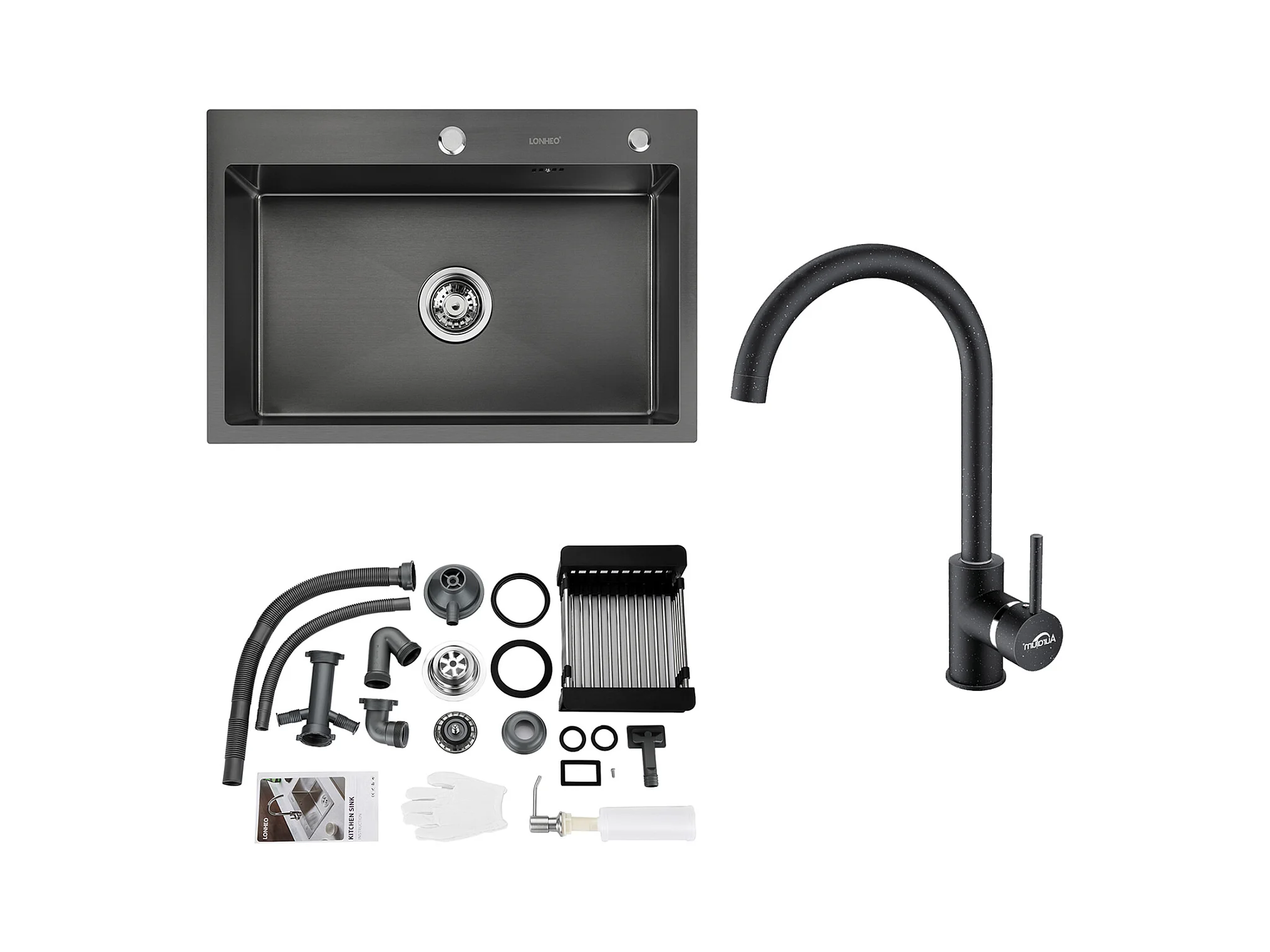 Fregadero de Cocina Negro 68x45x19CM con DistrubutEur de jabón y escurridor cesta + grifo de cocina cromado giratorio a 360° agua fría / caliente