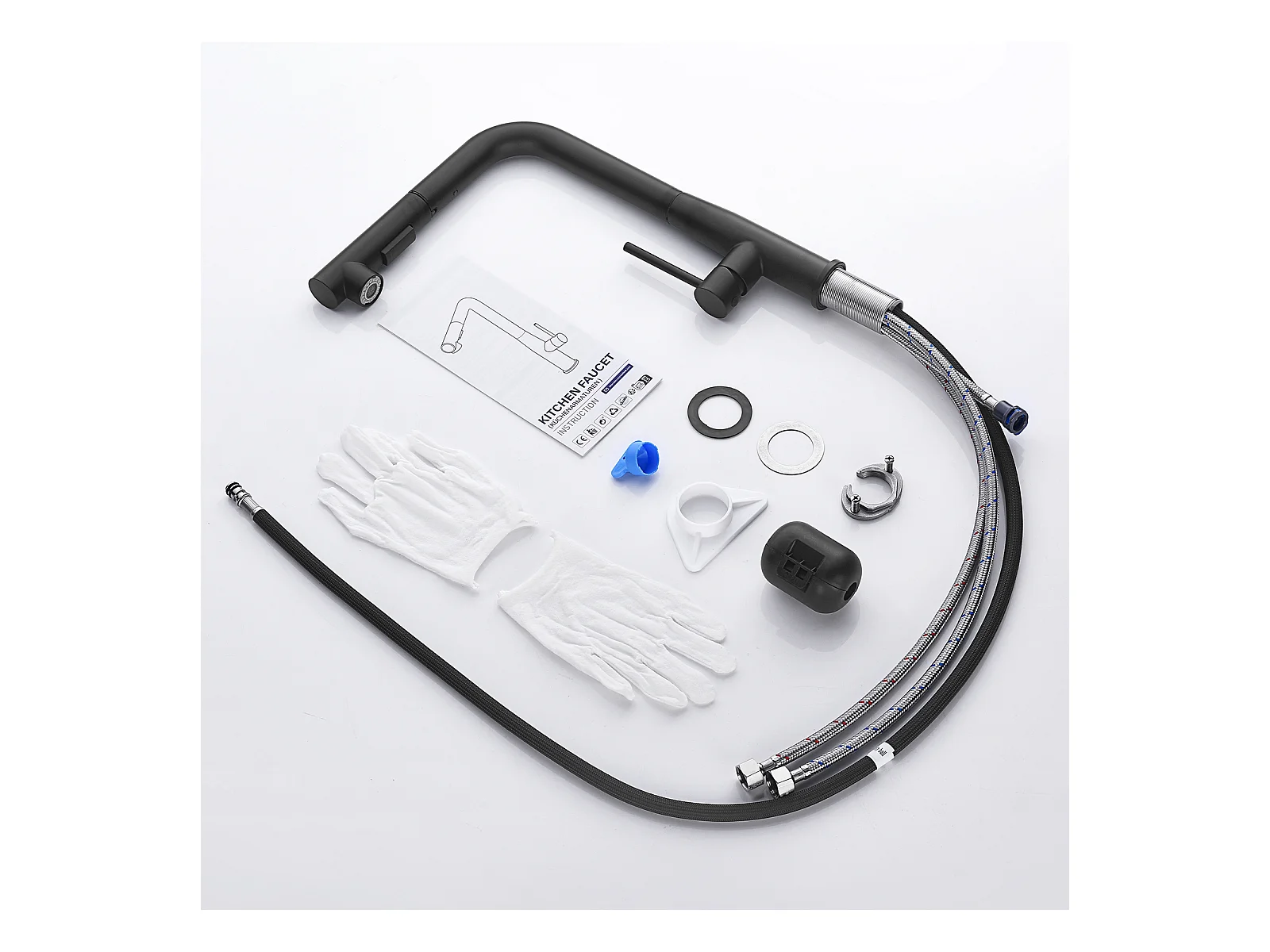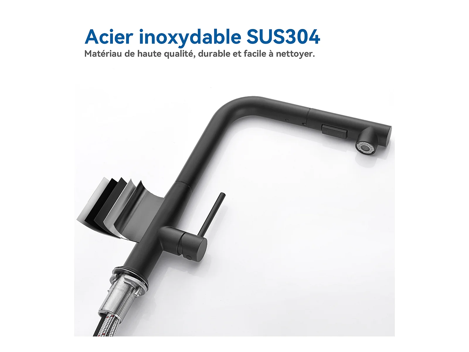 2PCS AURALUM MAX Grifo Cocina, Mezclador de Fregadero Inox con Ducha Extraíble,2 Modos Jets Agua Fría/Caliente Rotativo 360°, Boco en Forma L, Negro