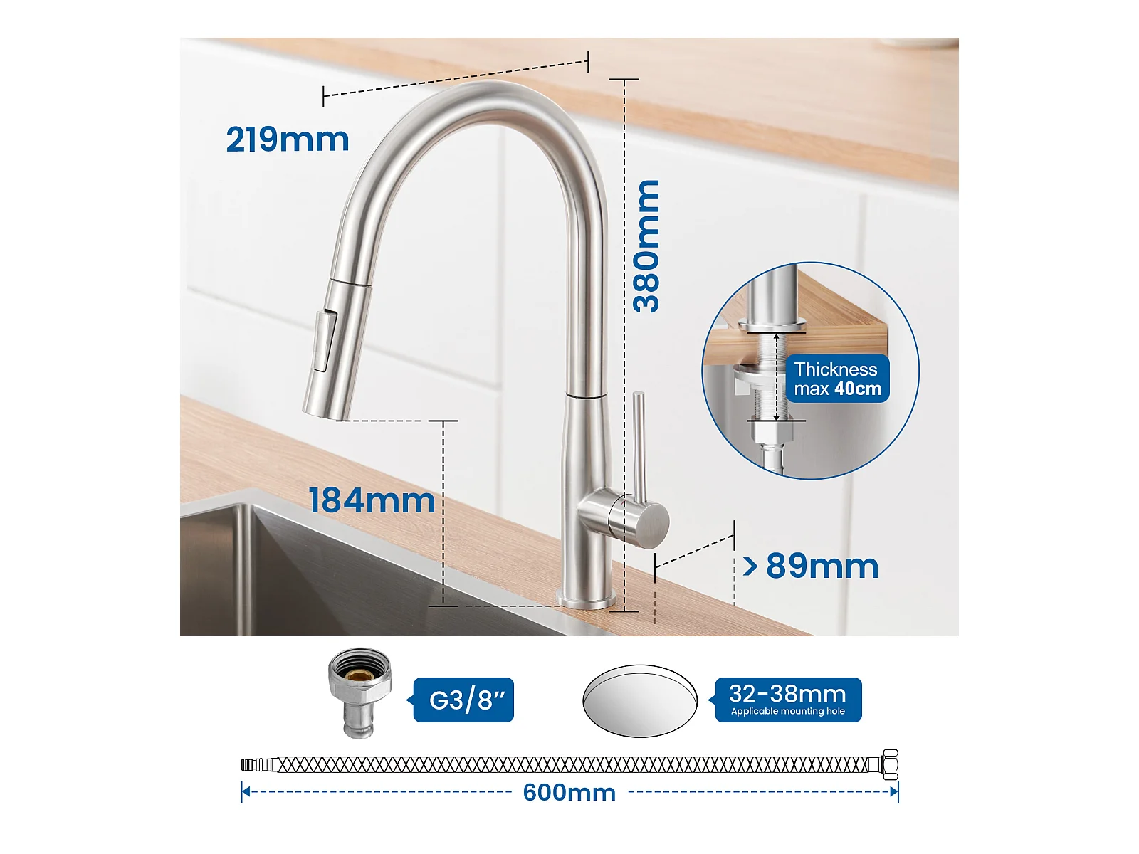 2PCS AURALUM MAX Grifo de cocina,Mezclador fregadero inox con ducha extraíble,2 modos de chorro de agua fría/caliente giratorios360°,cepillado