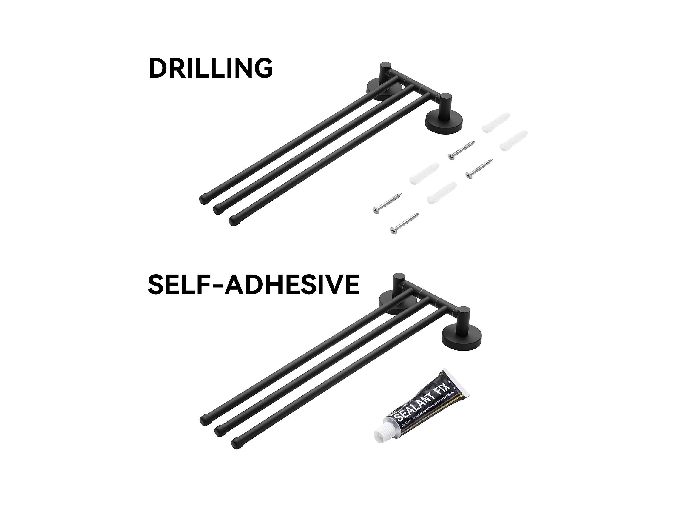 Toallero giratorio de 3 brazos de acero inoxidable negro 180°