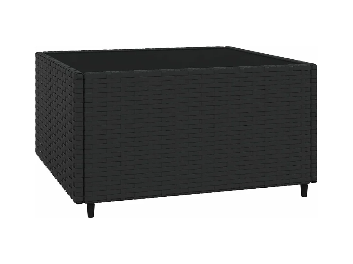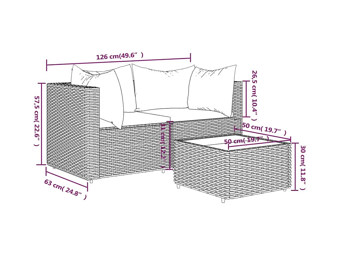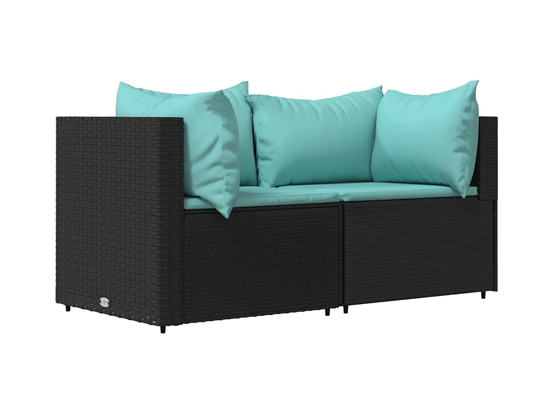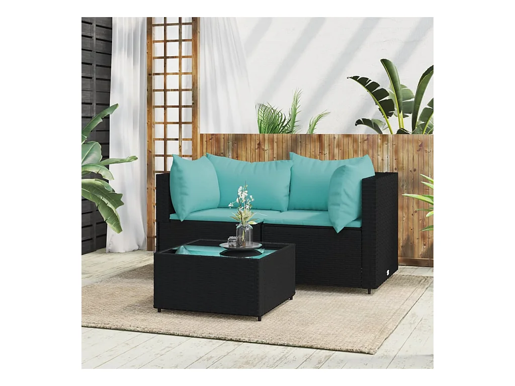 3 muebles de jardín con cojines de mimbre de resina negra.