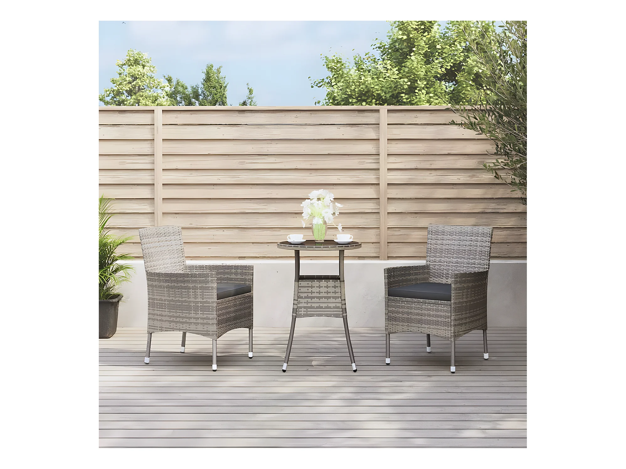 Set comedor jardín 3 piezas y cojines ratán sintético vidrio gris