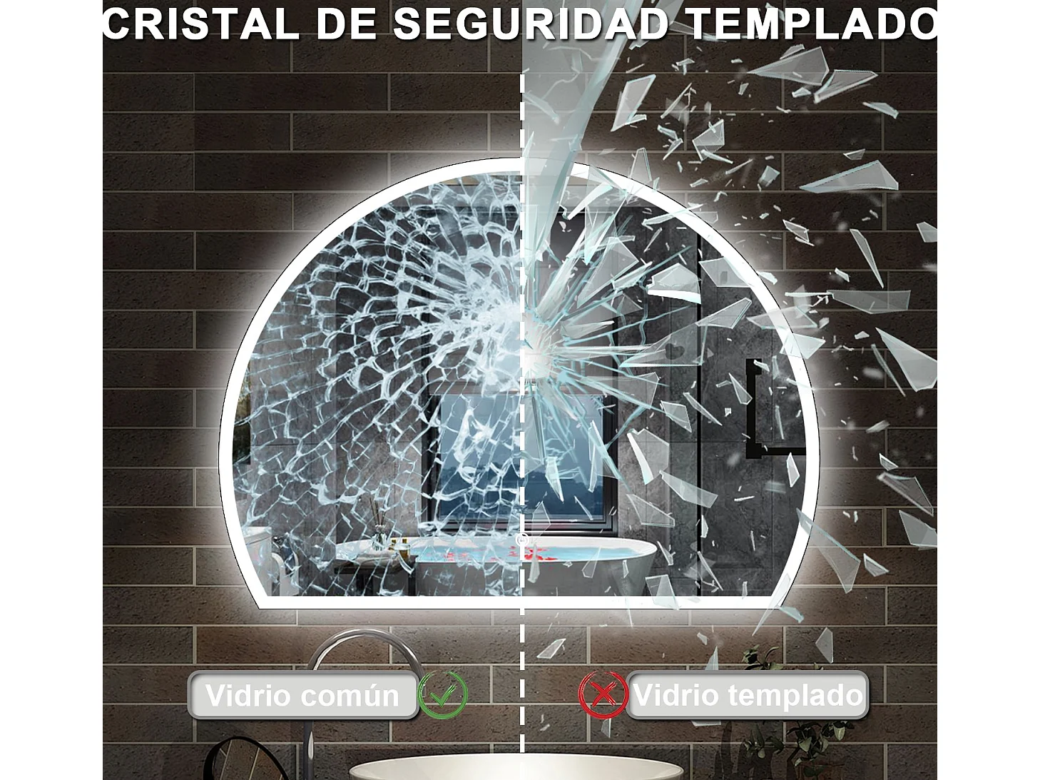 AICA Espejo de baño 80 x 60cm, Semicircular,antivaho,brillo ajustable y 3 colores ajustable