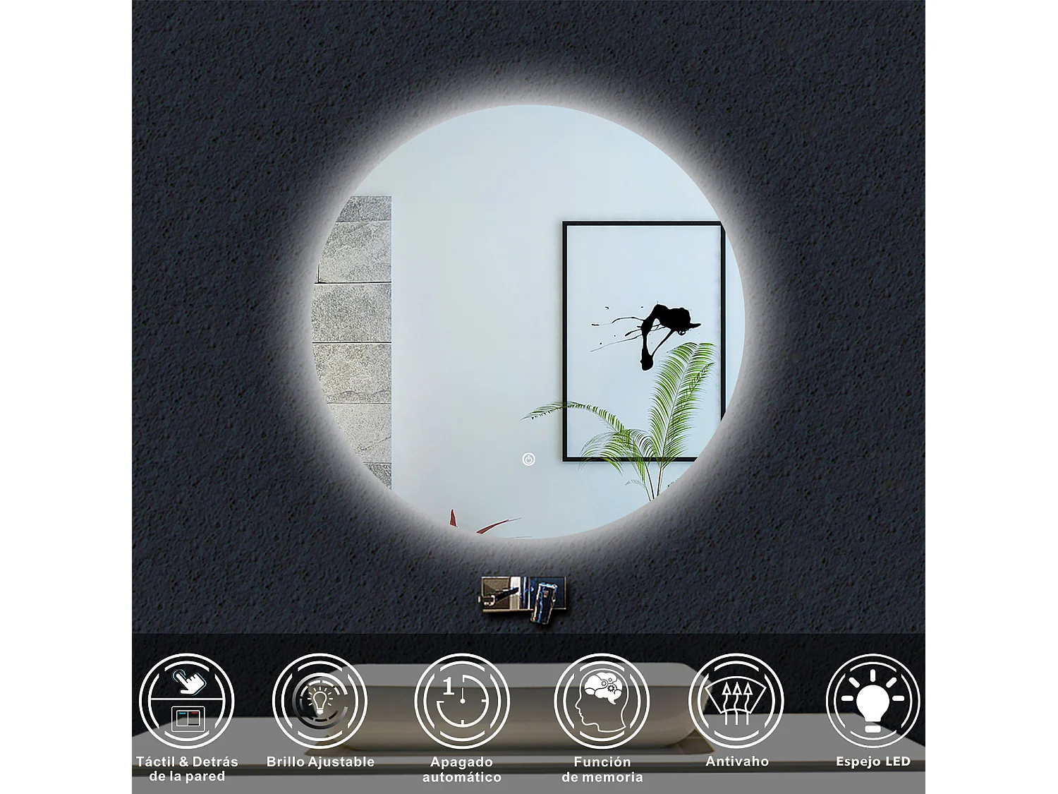 AICA Espejo de baño con iluminación LED Espejo redondo,70 x 70 cm, antivaho, brillo ajustable, memoria de apagado