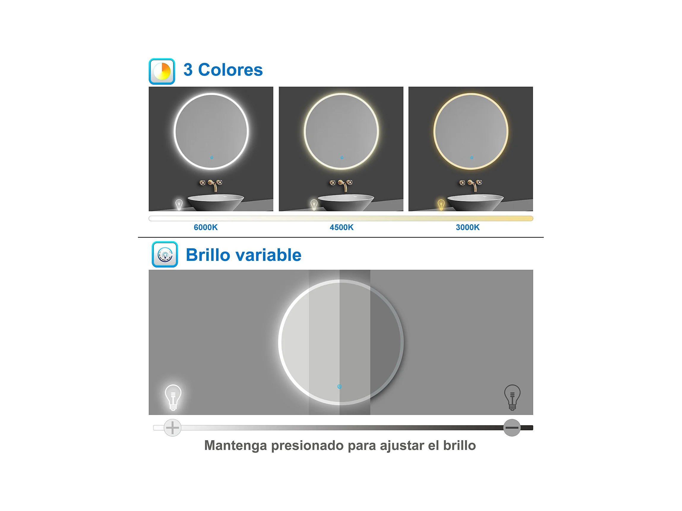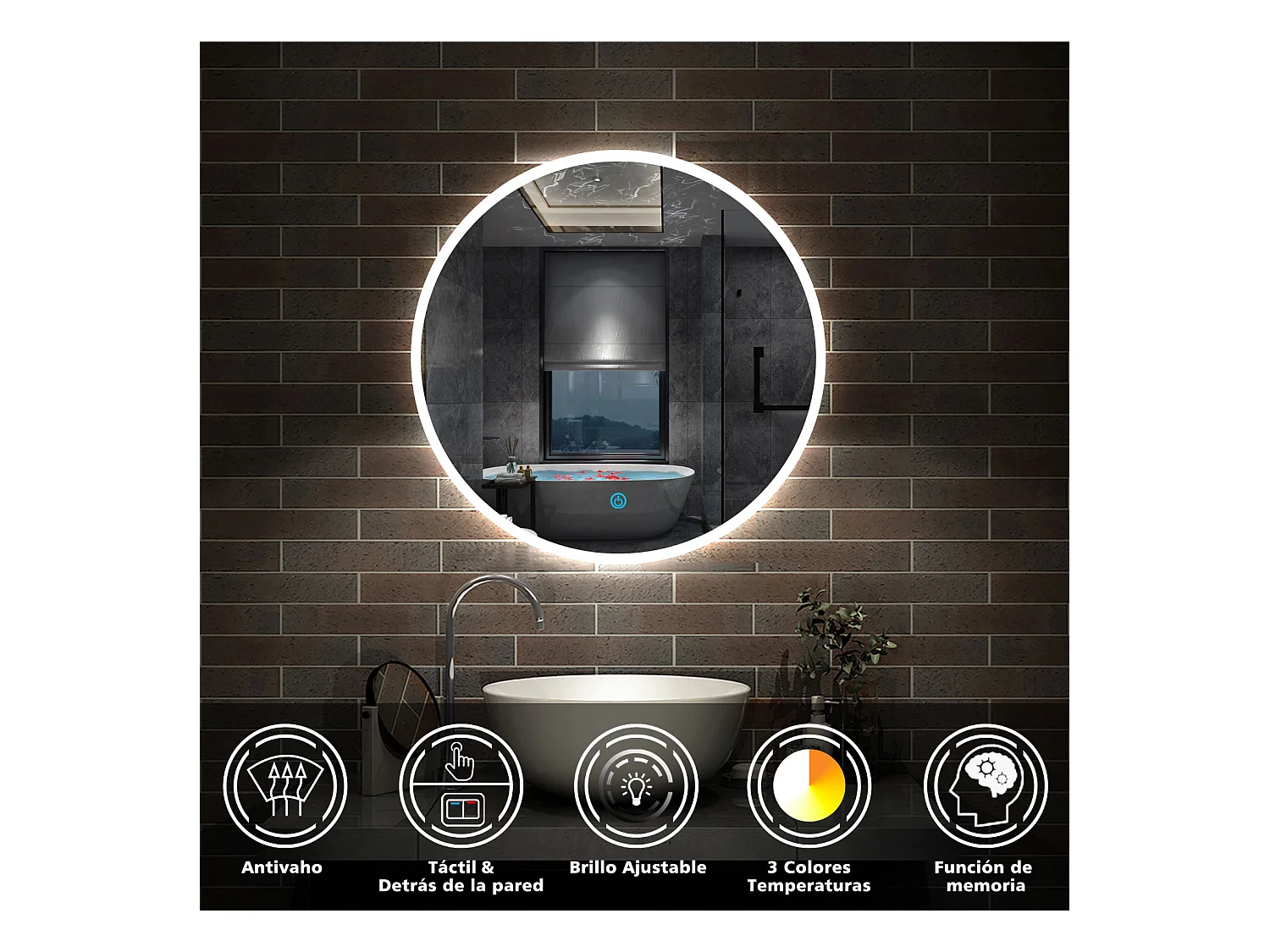 Aica Espejo de baño redondo LED 60×60cm, antivaho, luz tricolor regulable, función memoria
