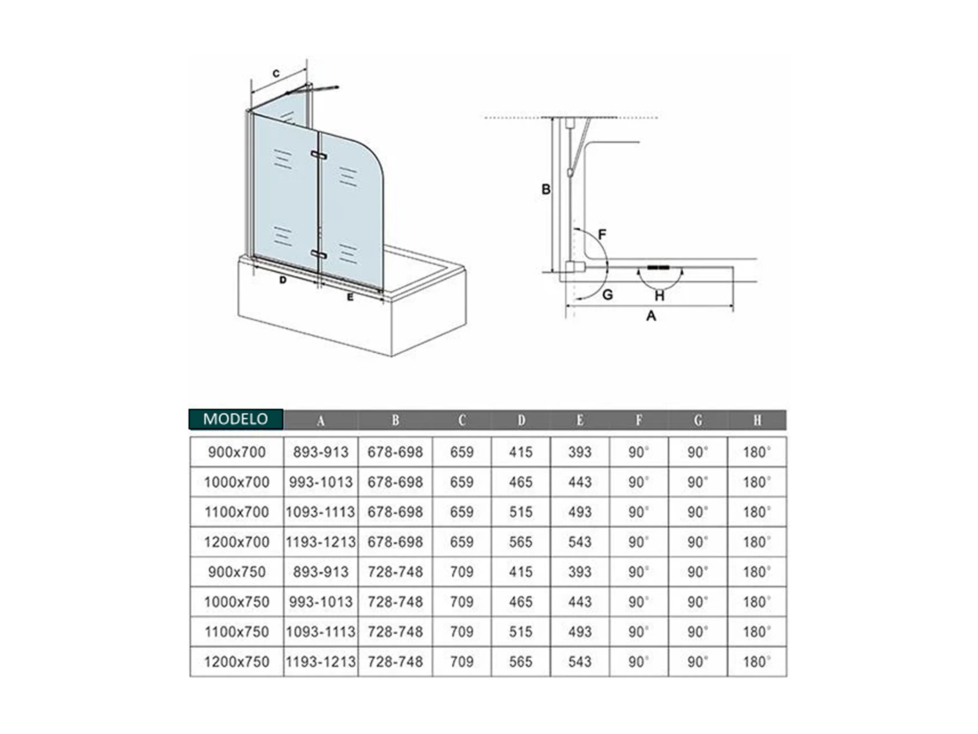 Mampara de bañera abatible 2 hojas con un panel fijo cristal antical 6mm plegable (1093-1113)x(678-698)x1400mm