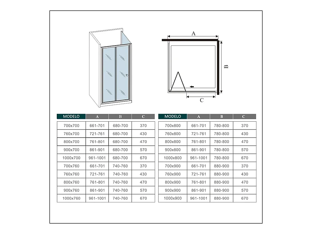 AICA Walk in 2 hojas plegables vidrio templado de 6mm con tratamiento antical Tamaño:(795-815)x1950mm