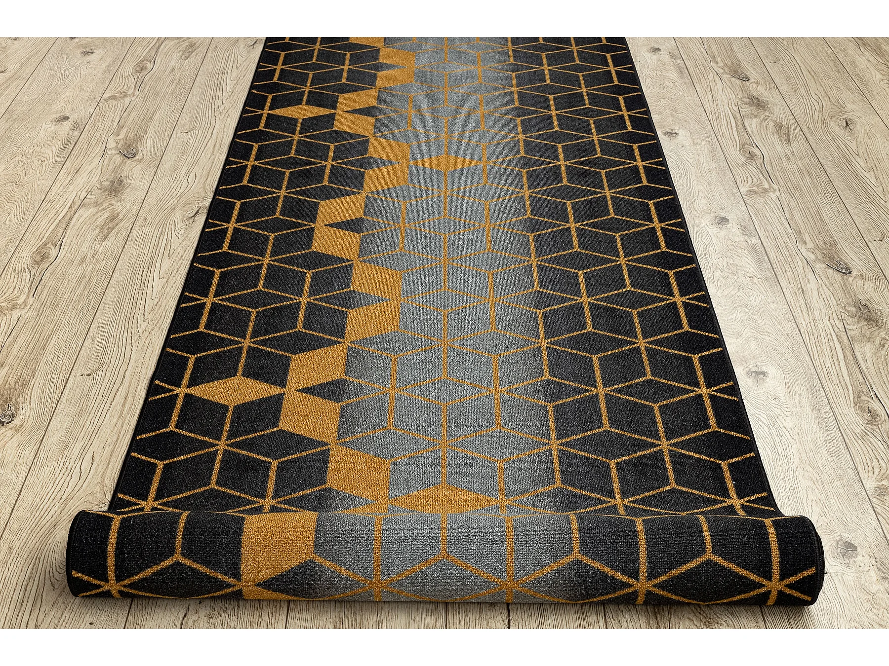 Alfombra de pasillo con refuerzo de goma HEKSAGON Hexágono negro / or 80x1300 cm