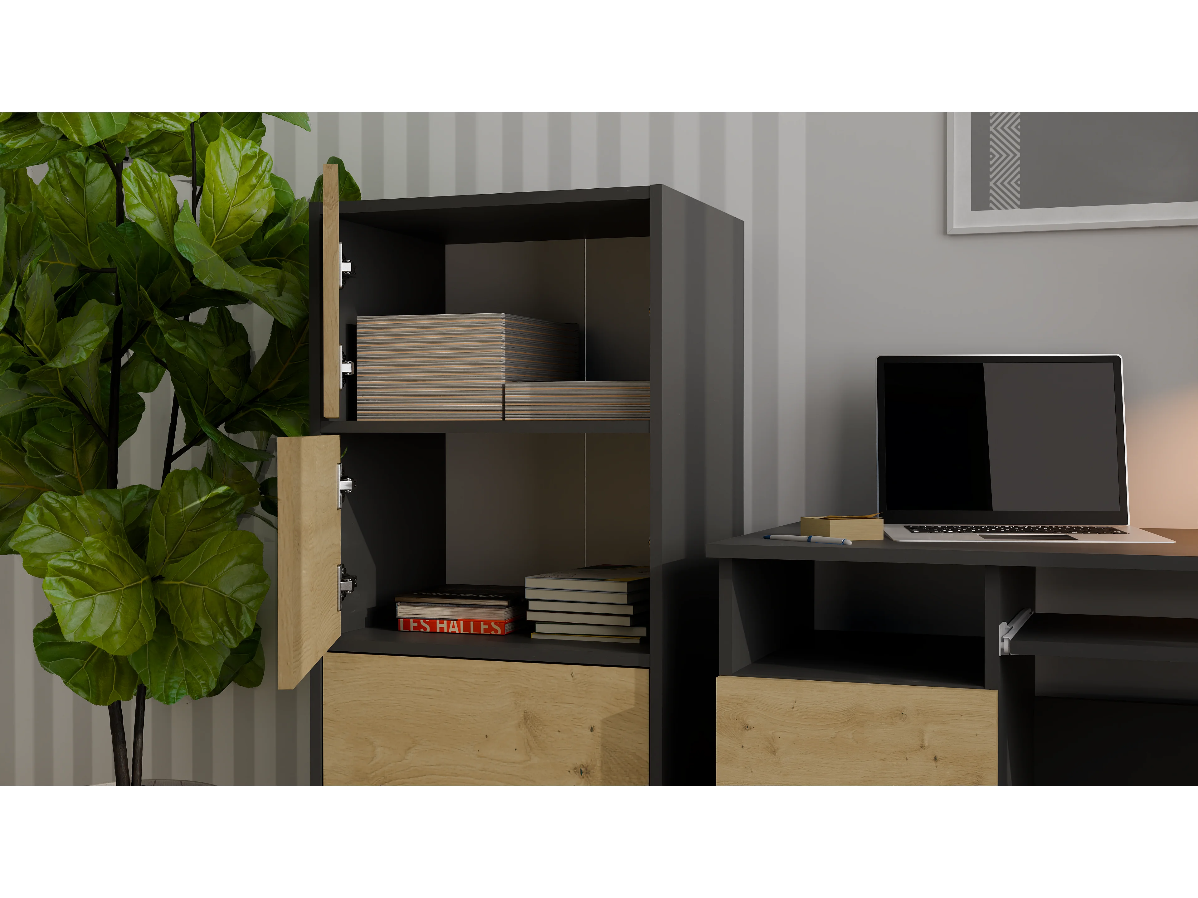 ALMA - Cómoda alta de almacenamiento con 4 puertas con apertura tip-on - Antracita y roble artesanal