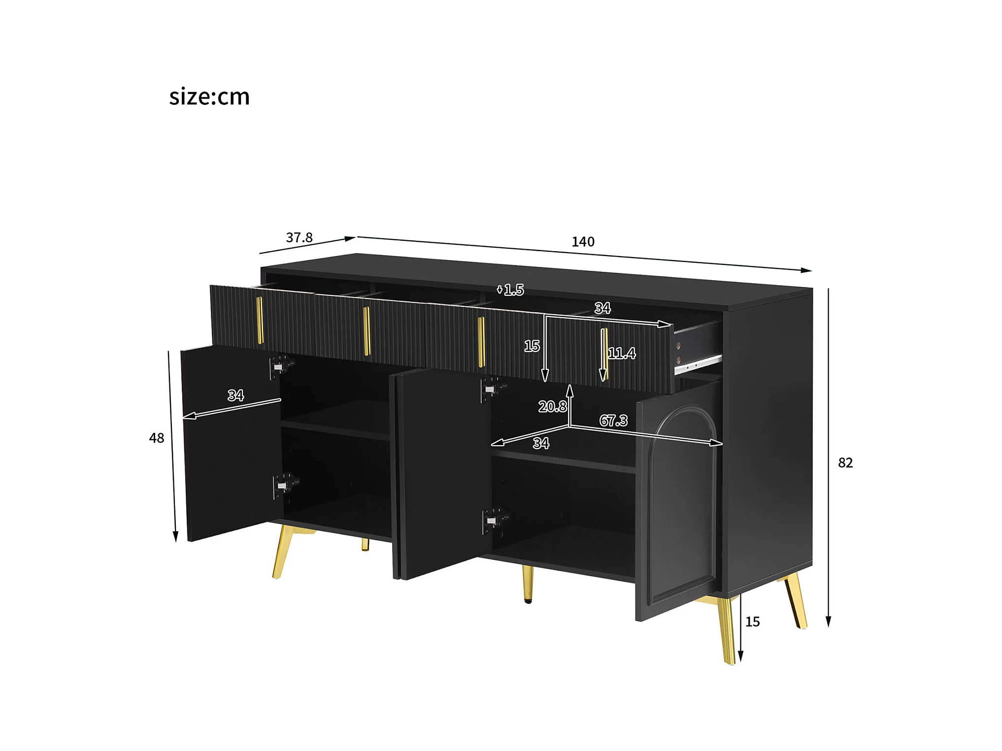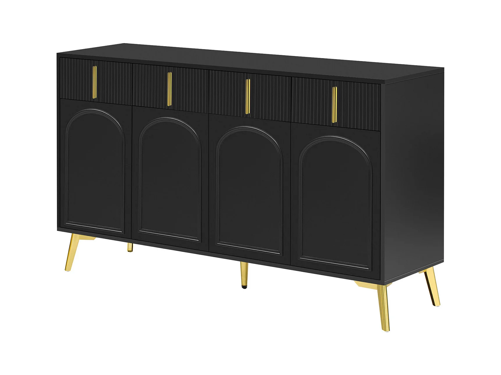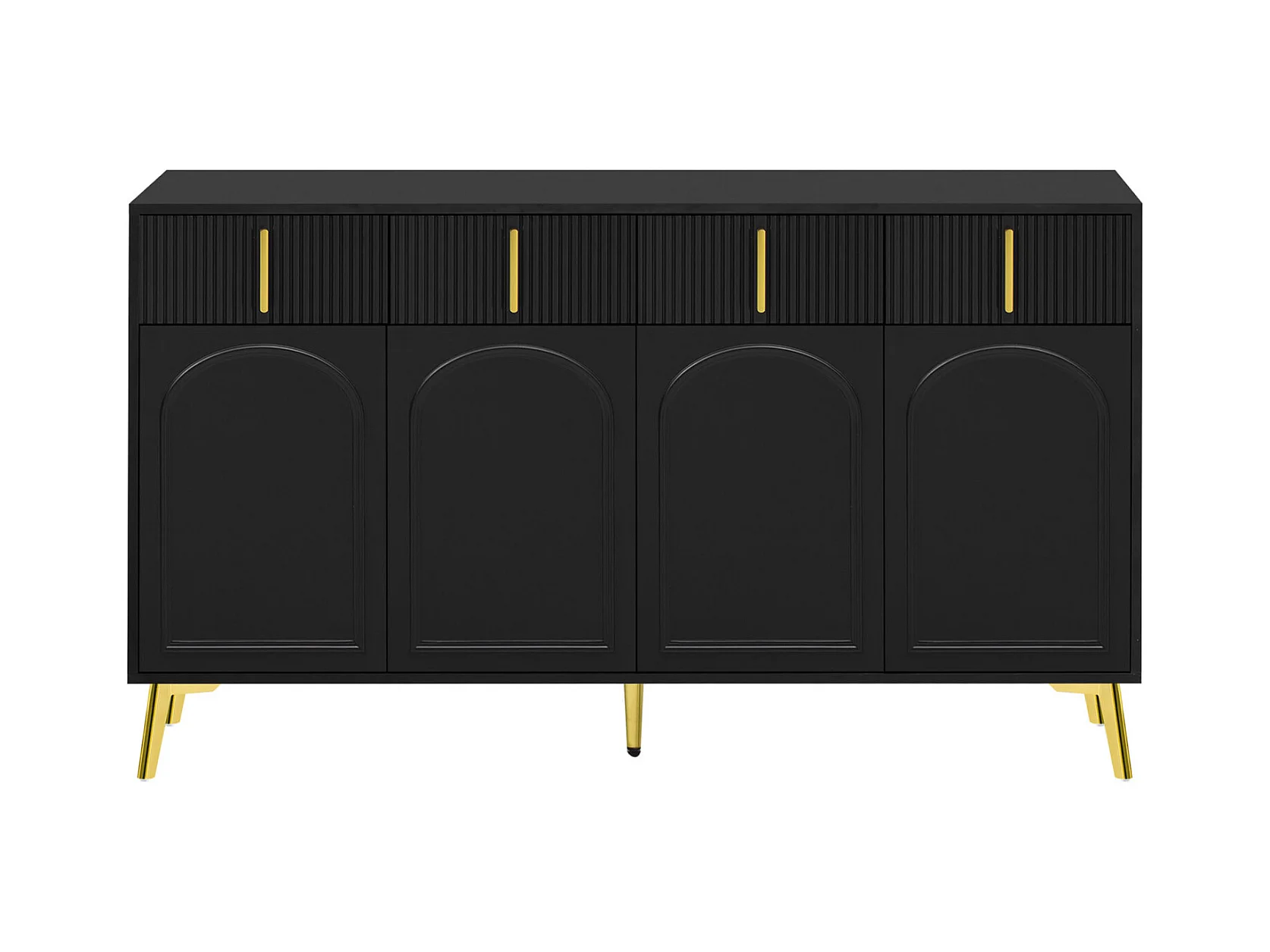 Aparador 140x37,8x82cm - con 4 puertas, 4 cajones, tiradores y patas dorados - laminado extraíble - NEGRO