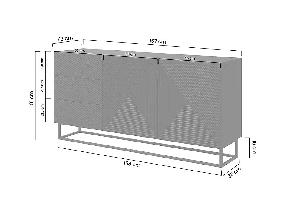 Aparador de 3 puertas y 3 cajones con patas de metal negro, 154x83 cm