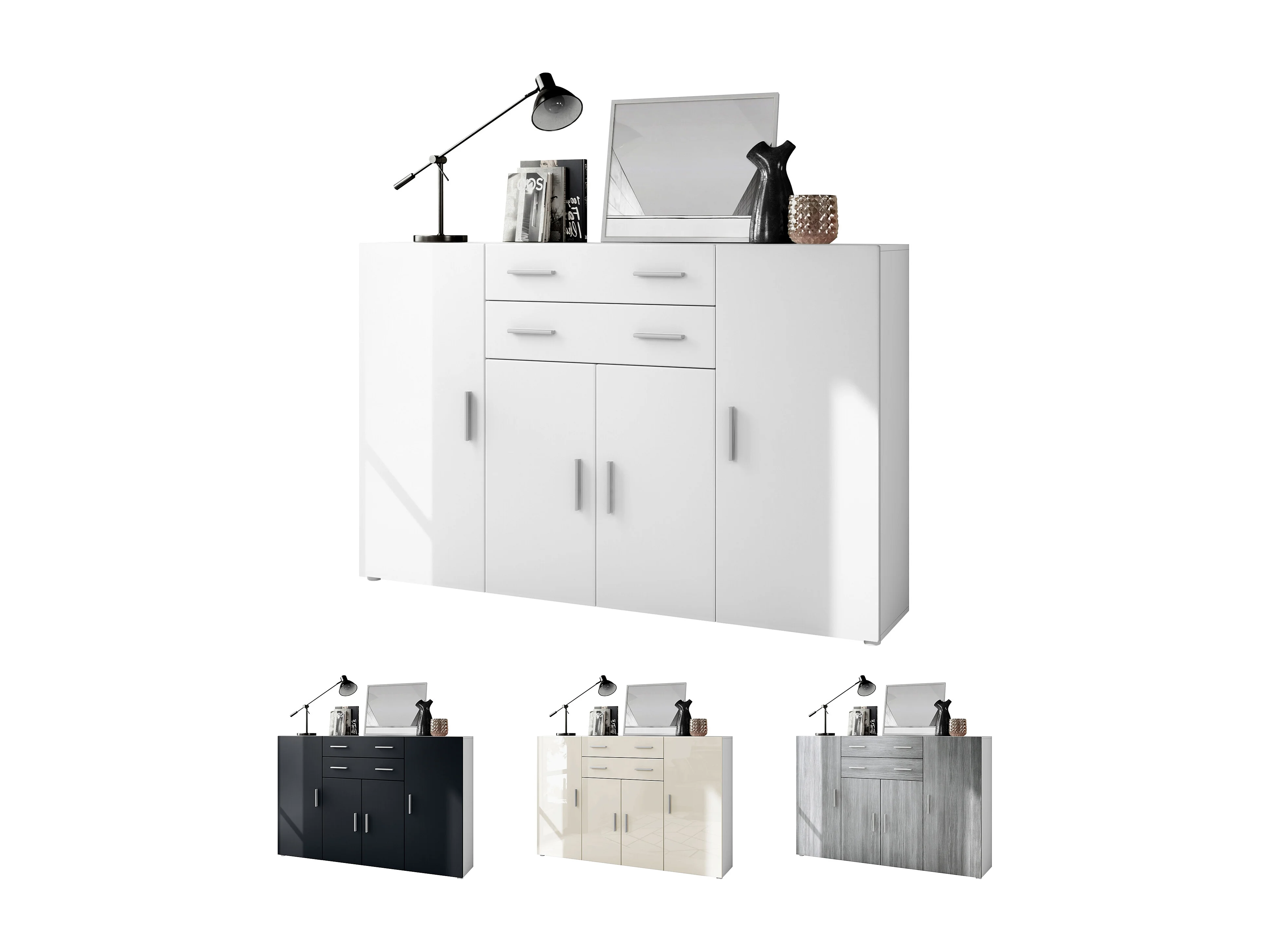 Aparador Grömitz V2 – Mueble con 2 Puertas Grandes y 4 Cajones, blanco mate/negro de alto brillo (166,5 x 75,5 x 35)