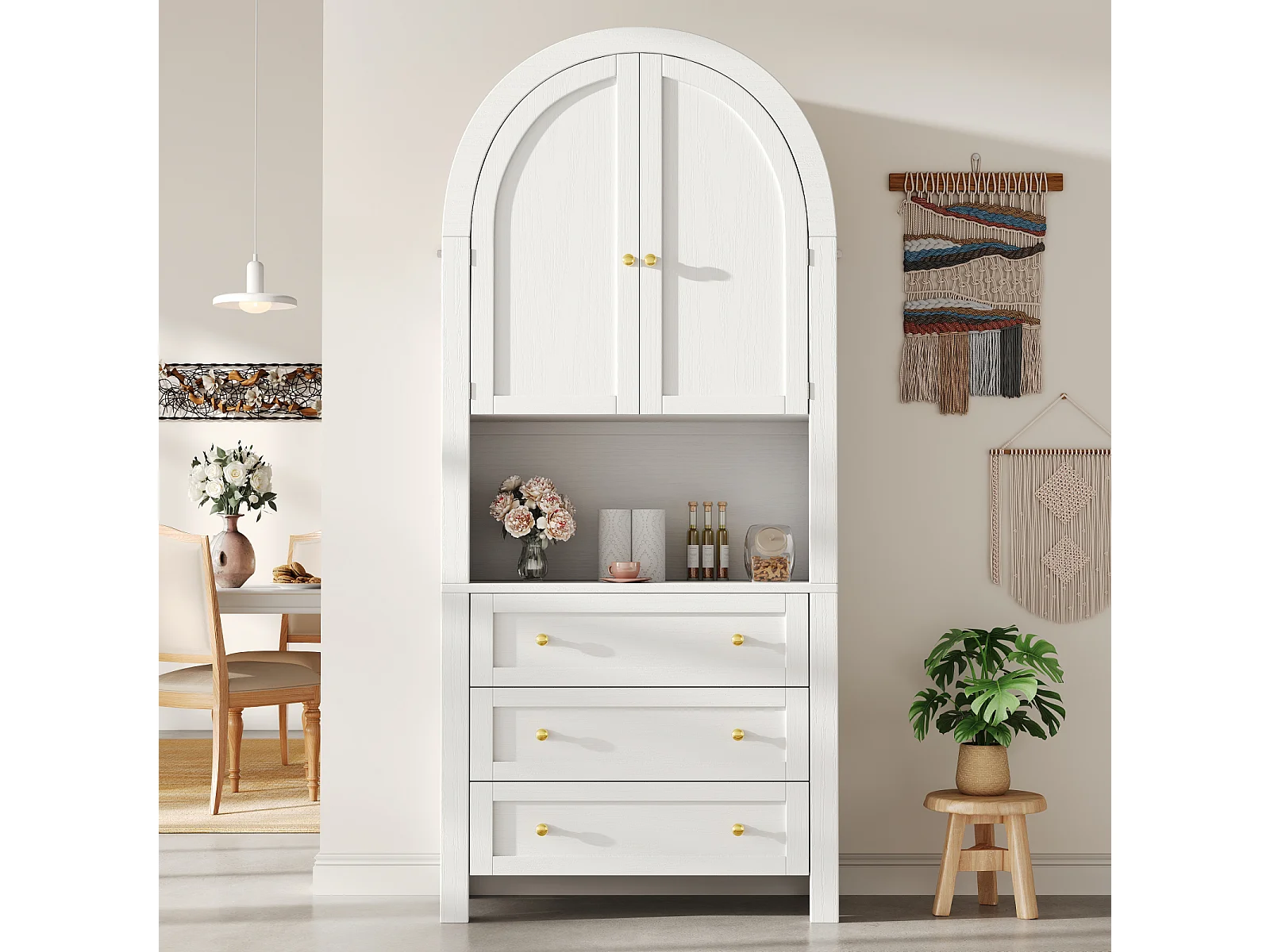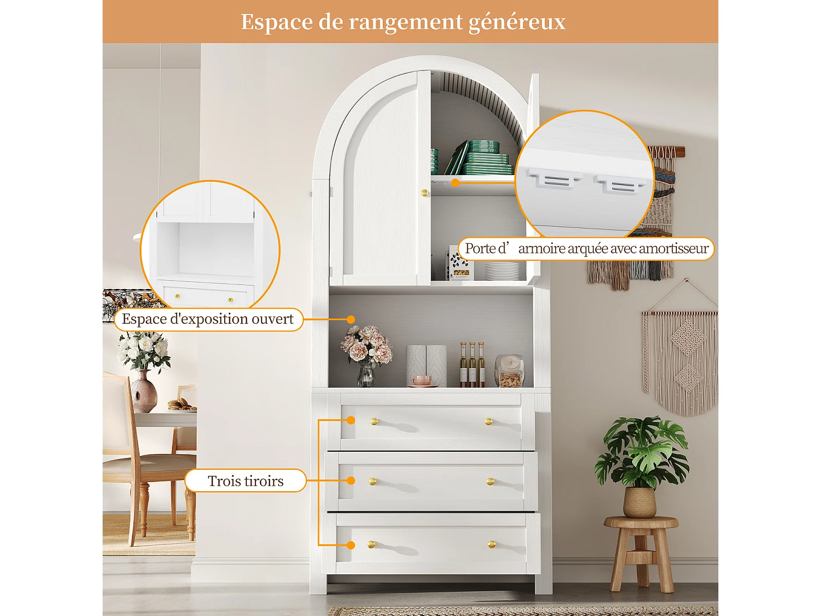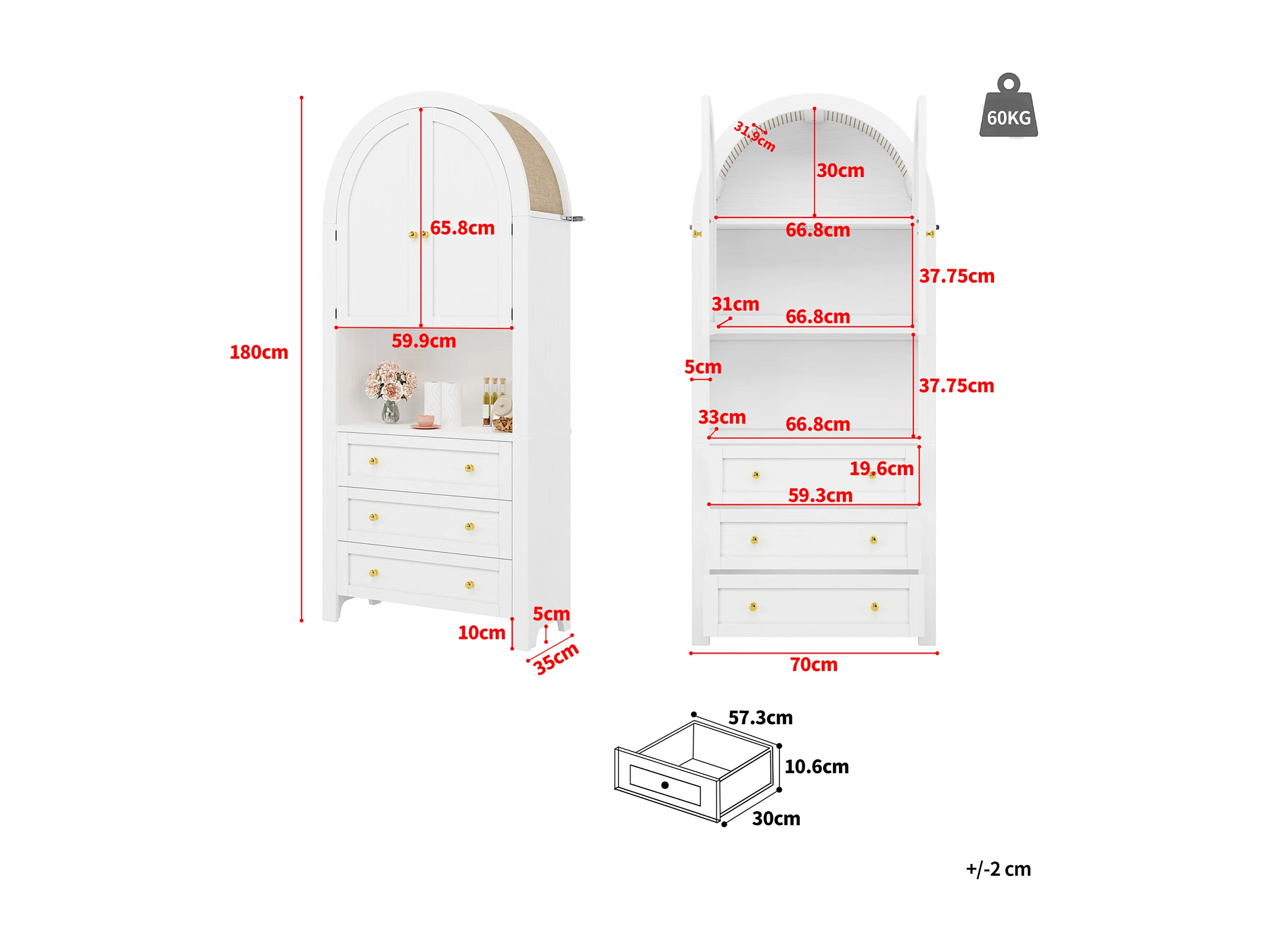 Aparador alto de almacenaje - 70 x 35 x 180 cm - arqueado con 3 cajones y 2 puertas - MDF - blanco