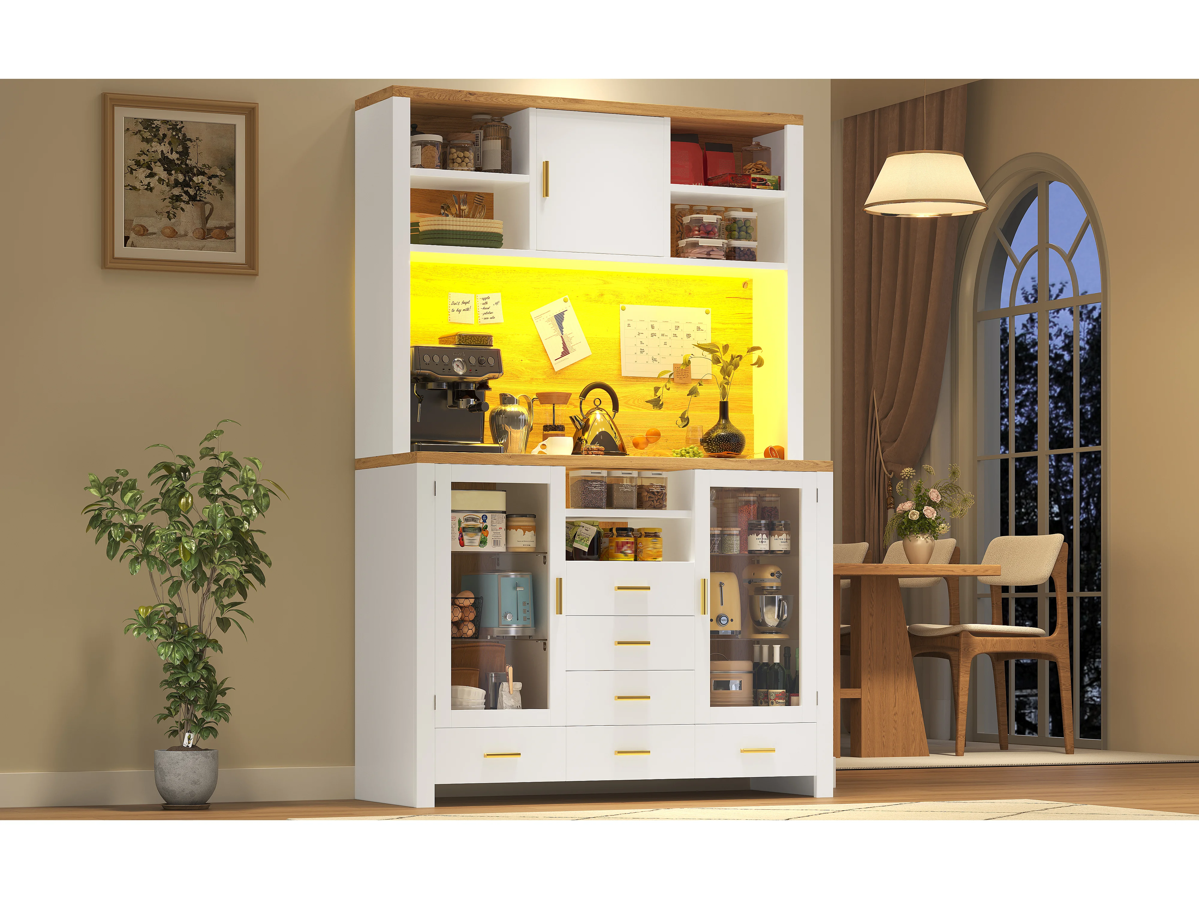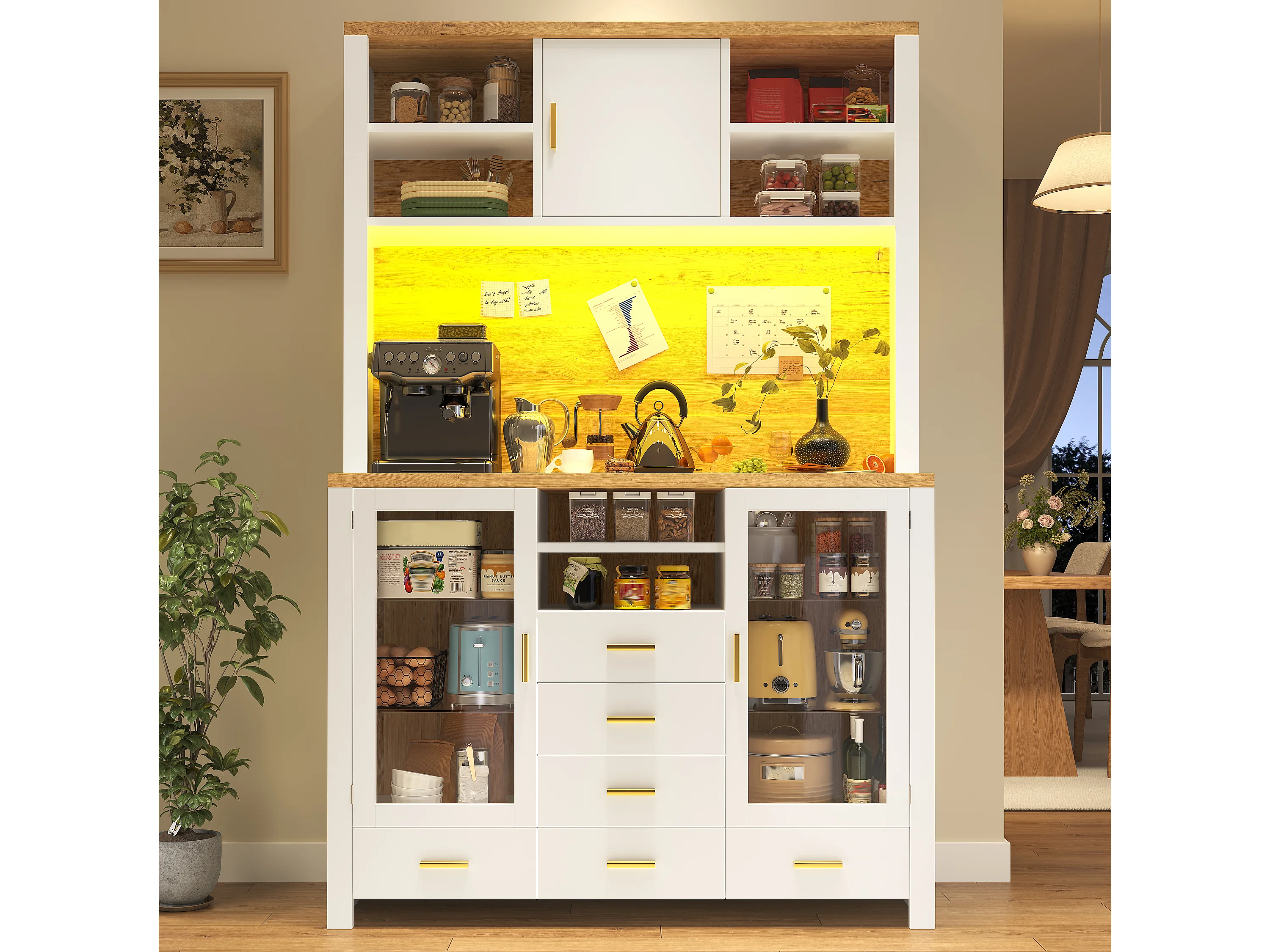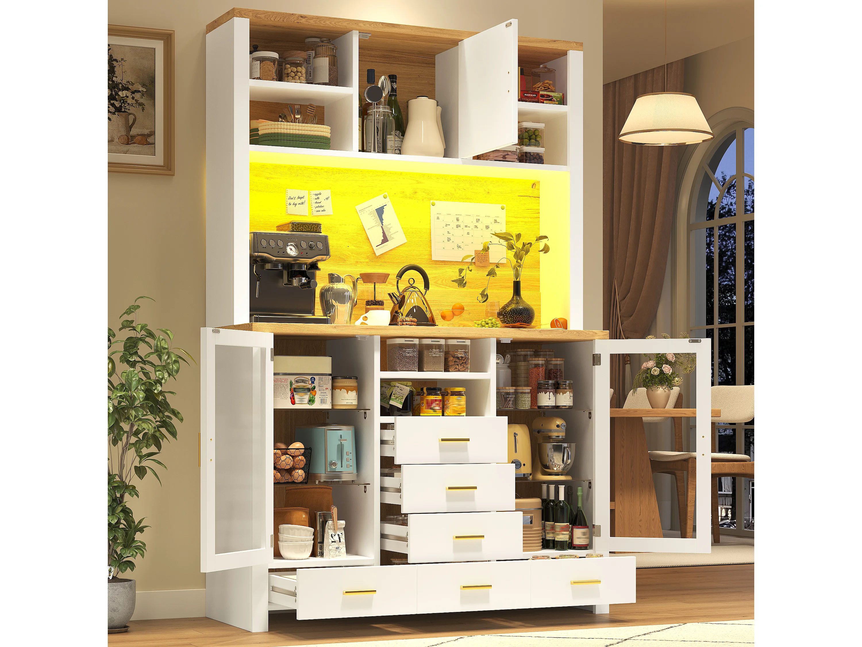 Aparador alto de cocina - 120 x 40 x 188 cm - estilo rústico - con LED + 6 cajones + 3 puertas + estantes - MDF - blanco