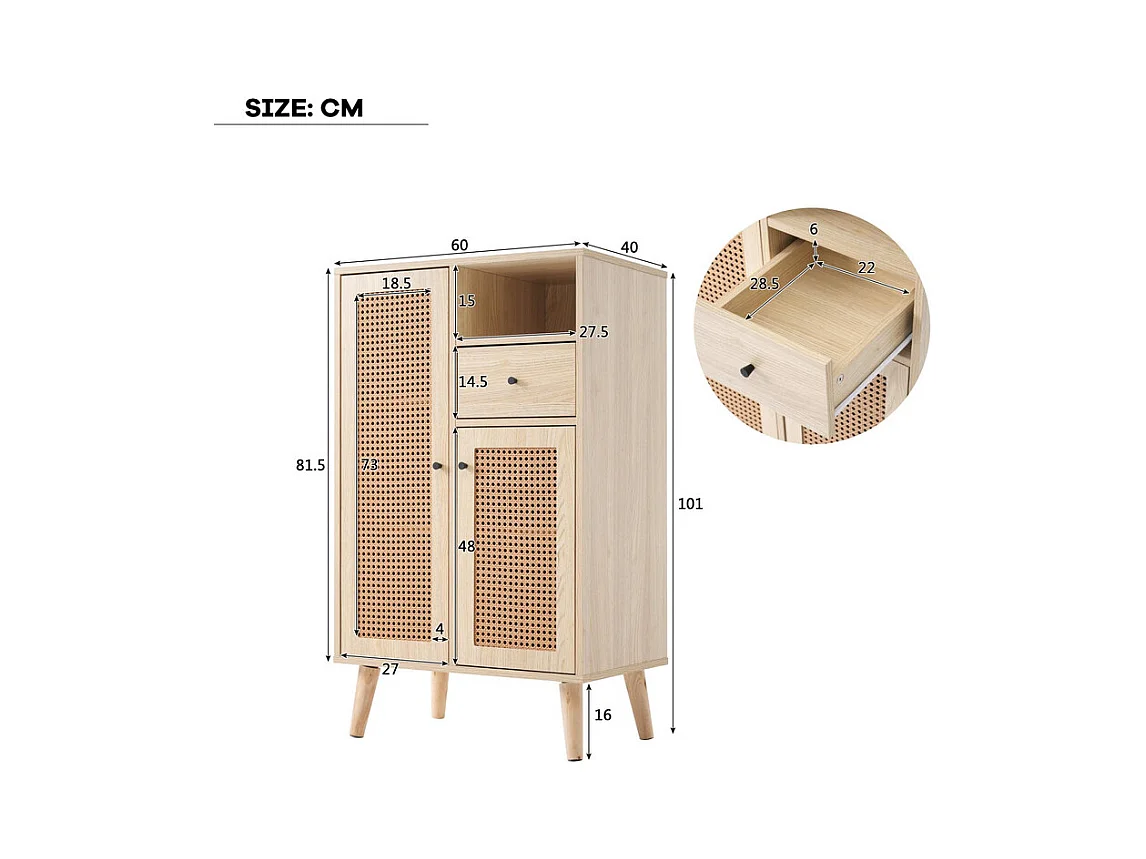 Aparador alto - 2 puertas de ratán y 1 cajón - estilo rústico - Natural