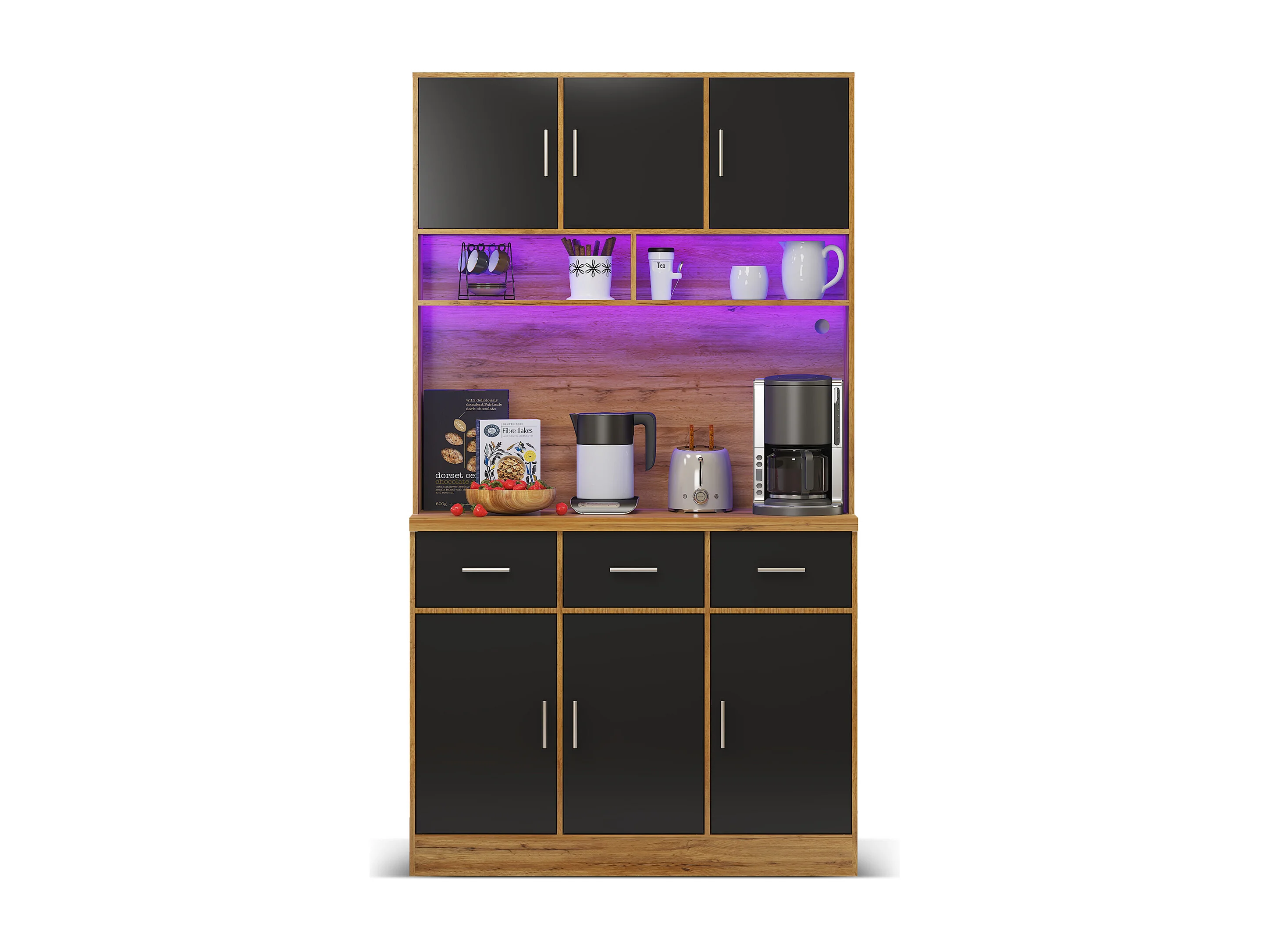 Aparador negro moderno con iluminación LED integrada, amplio espacio de almacenamiento, diseño minimalista y superficie elegante y funcional.