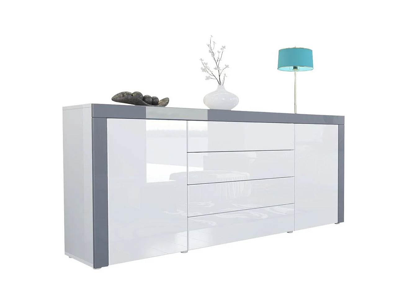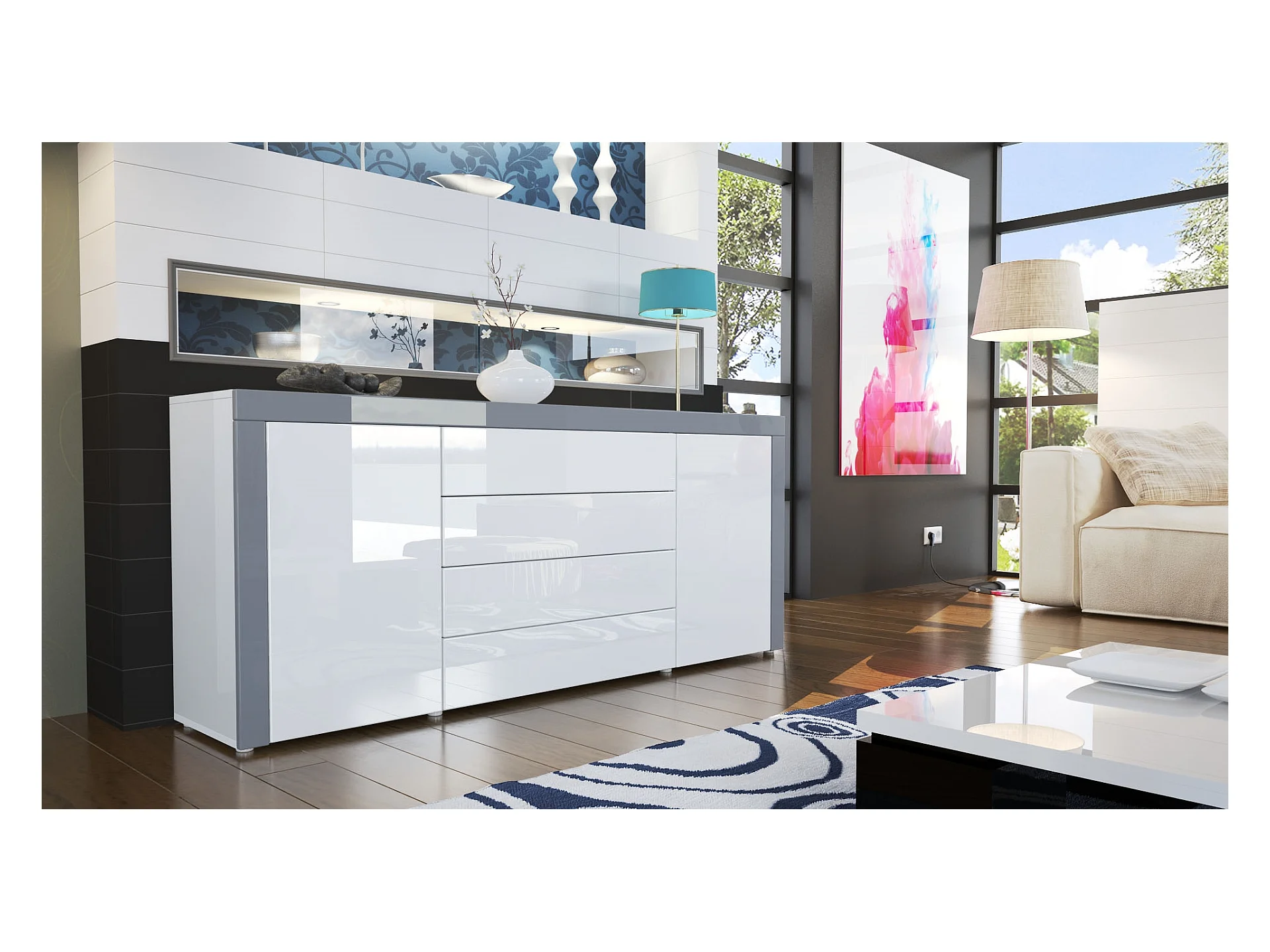 Aparador Cómoda La Paz, cuerpo en blanco de alto brillo / Frente en blanco de alto brillo con marco en gris de alto brillo