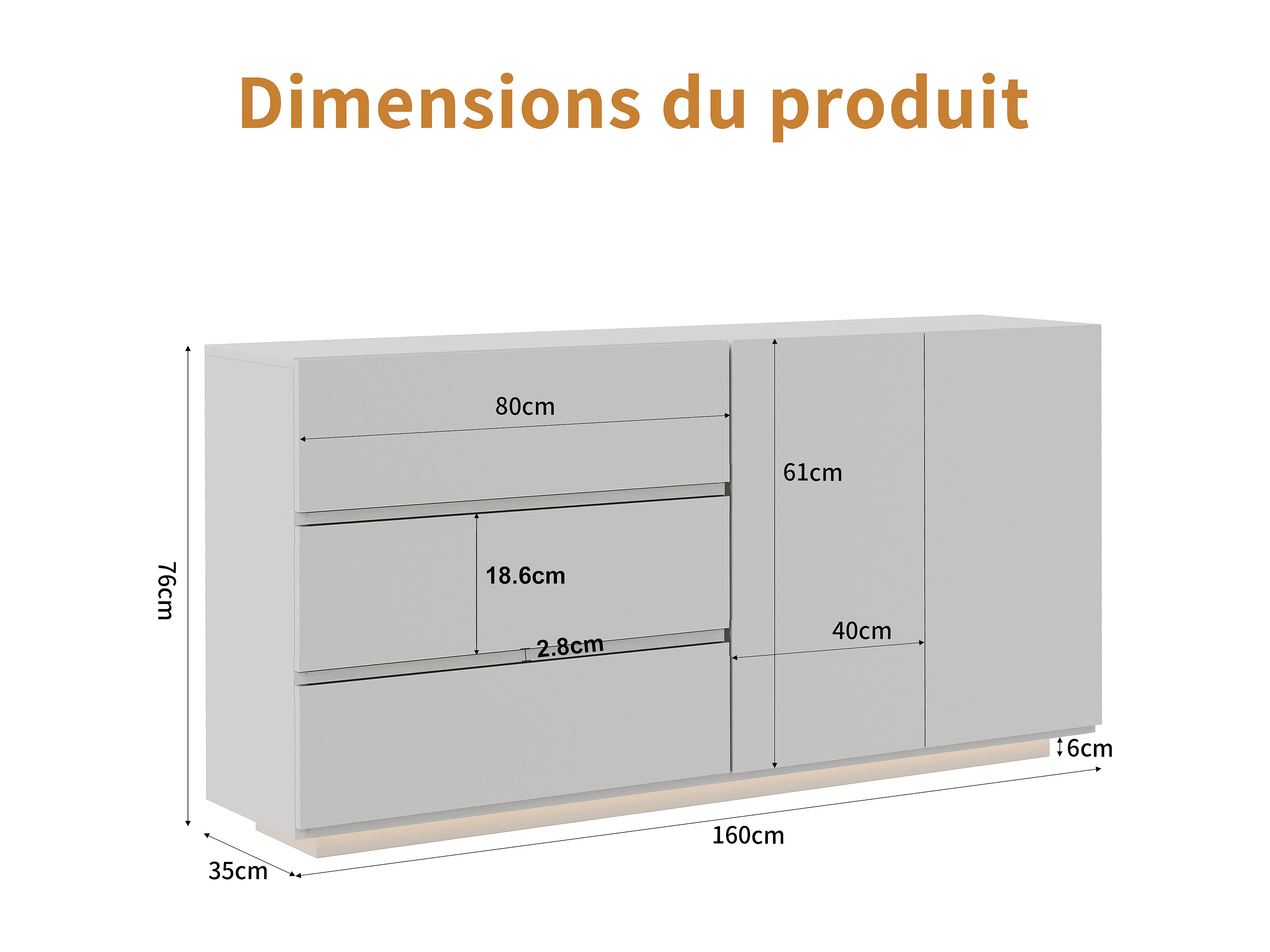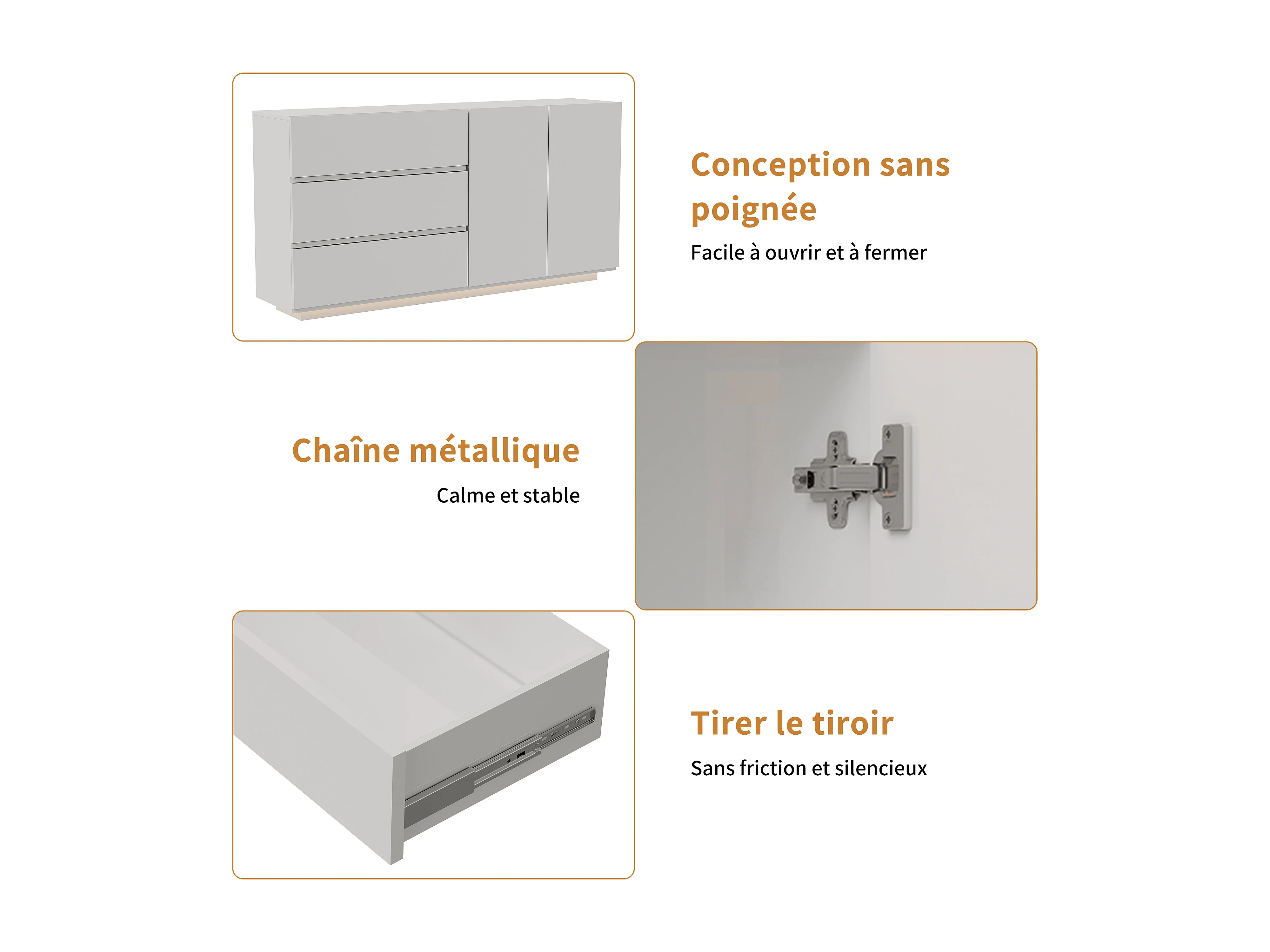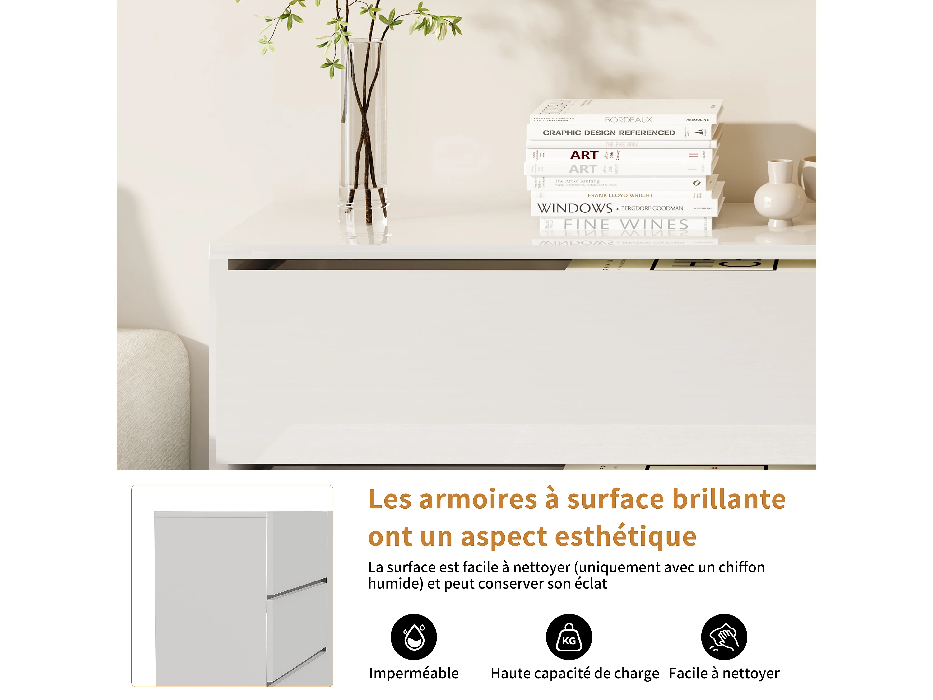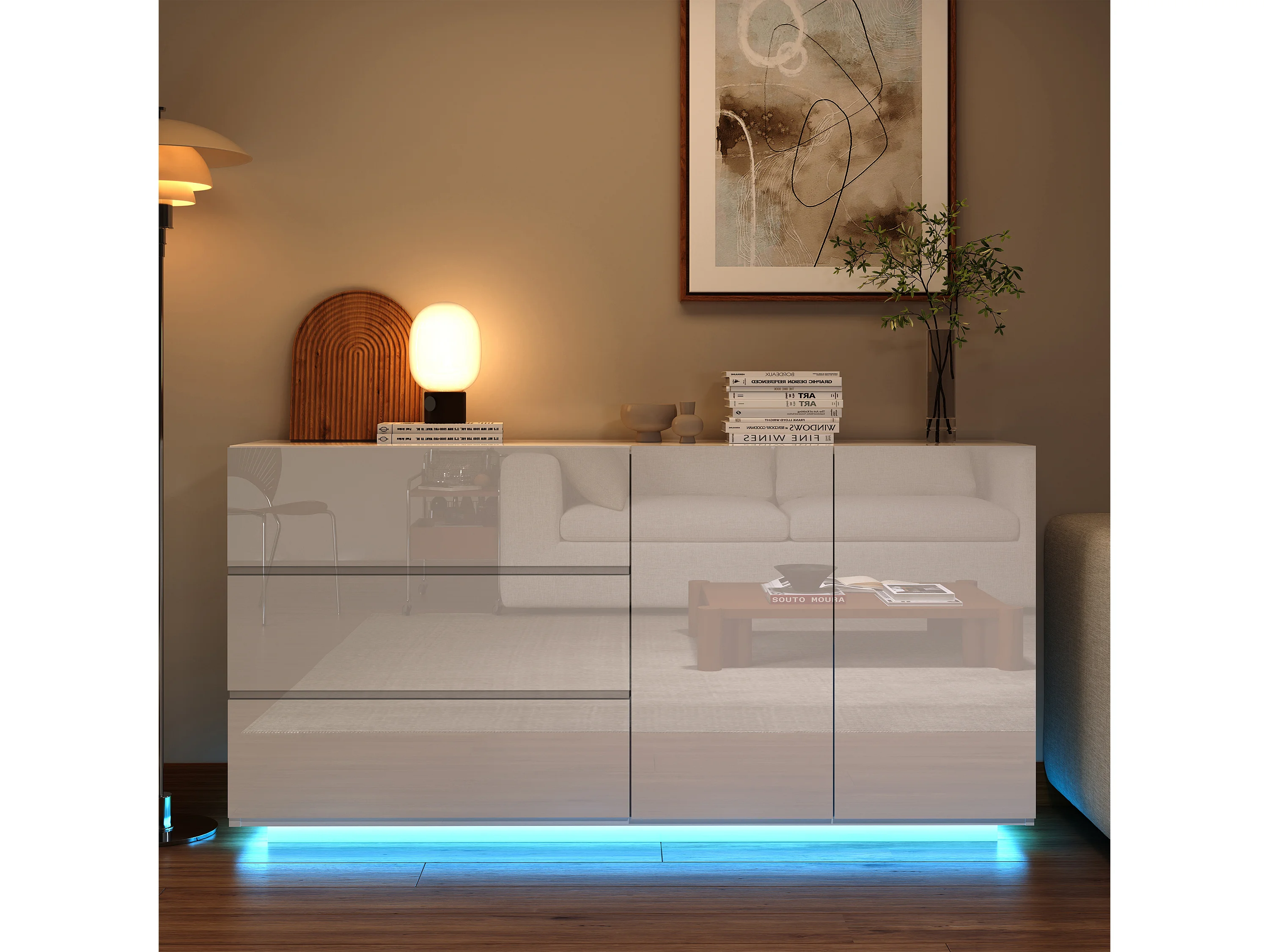 Aparador/cómoda lacado alto brillo con 2 puertas y 3 cajones, mueble de salón con iluminación LED, mueble de cocina, color blanco