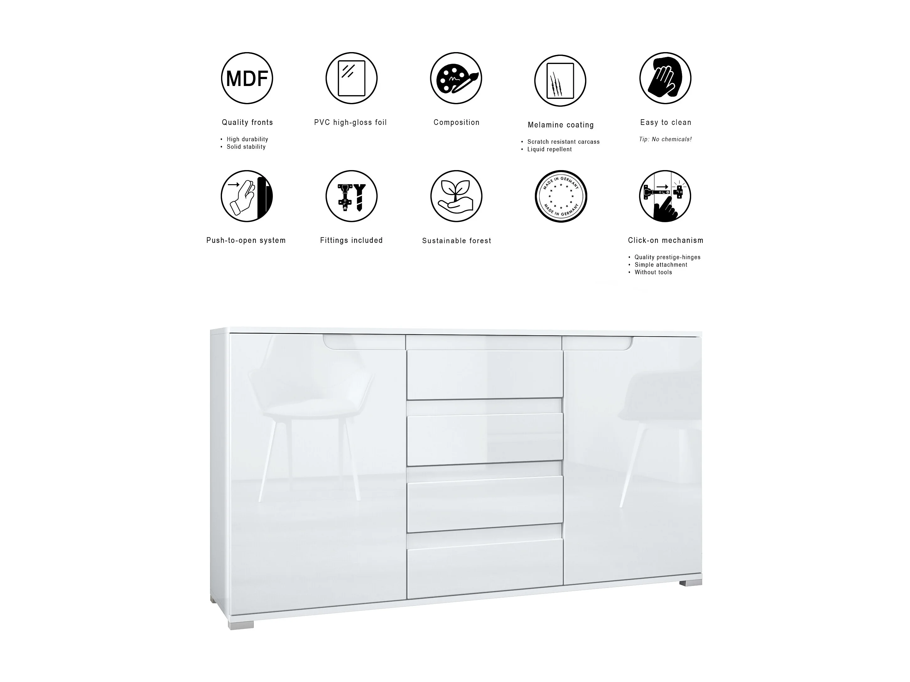 Aparador Faro V1 – Mueble con 2 Puertas y 4 Cajones, Armario con Tira de Luz LED, blanco mate / blanco de alto brillo (138,5 x 75,5 x 35)