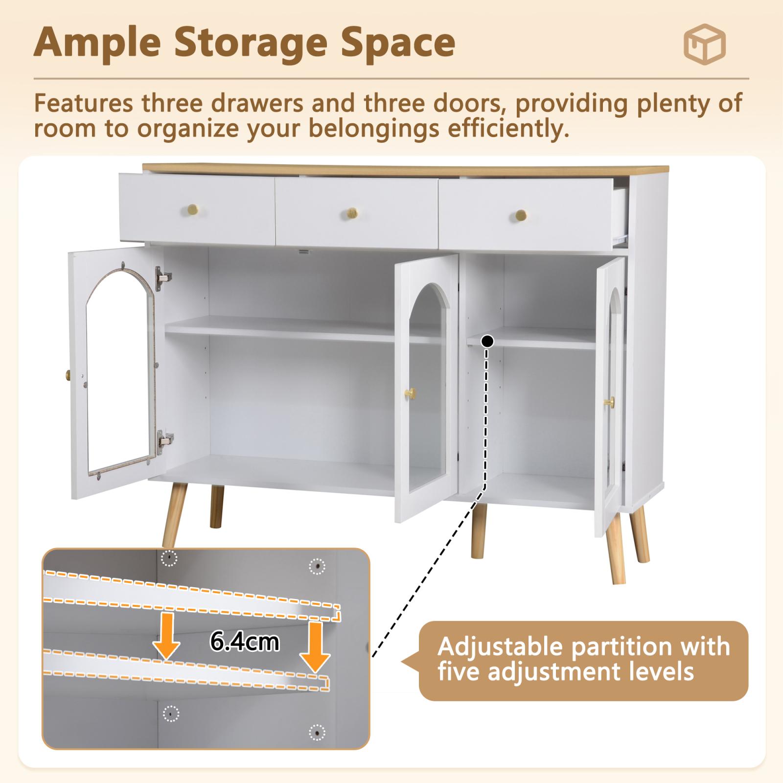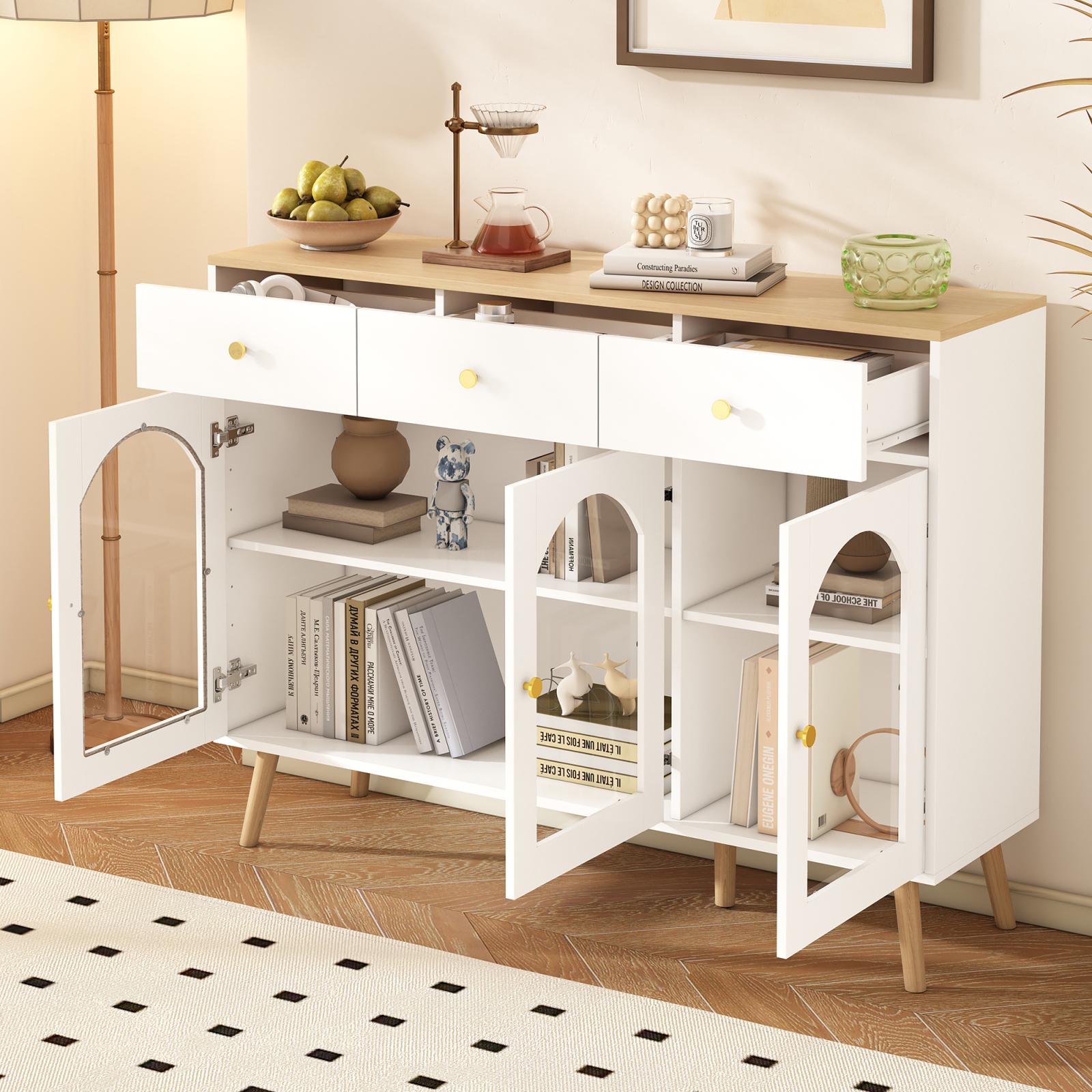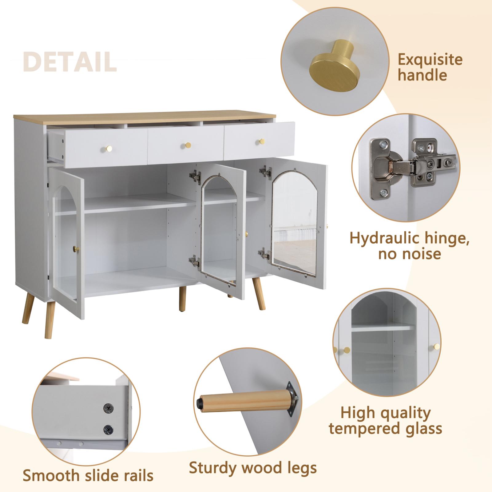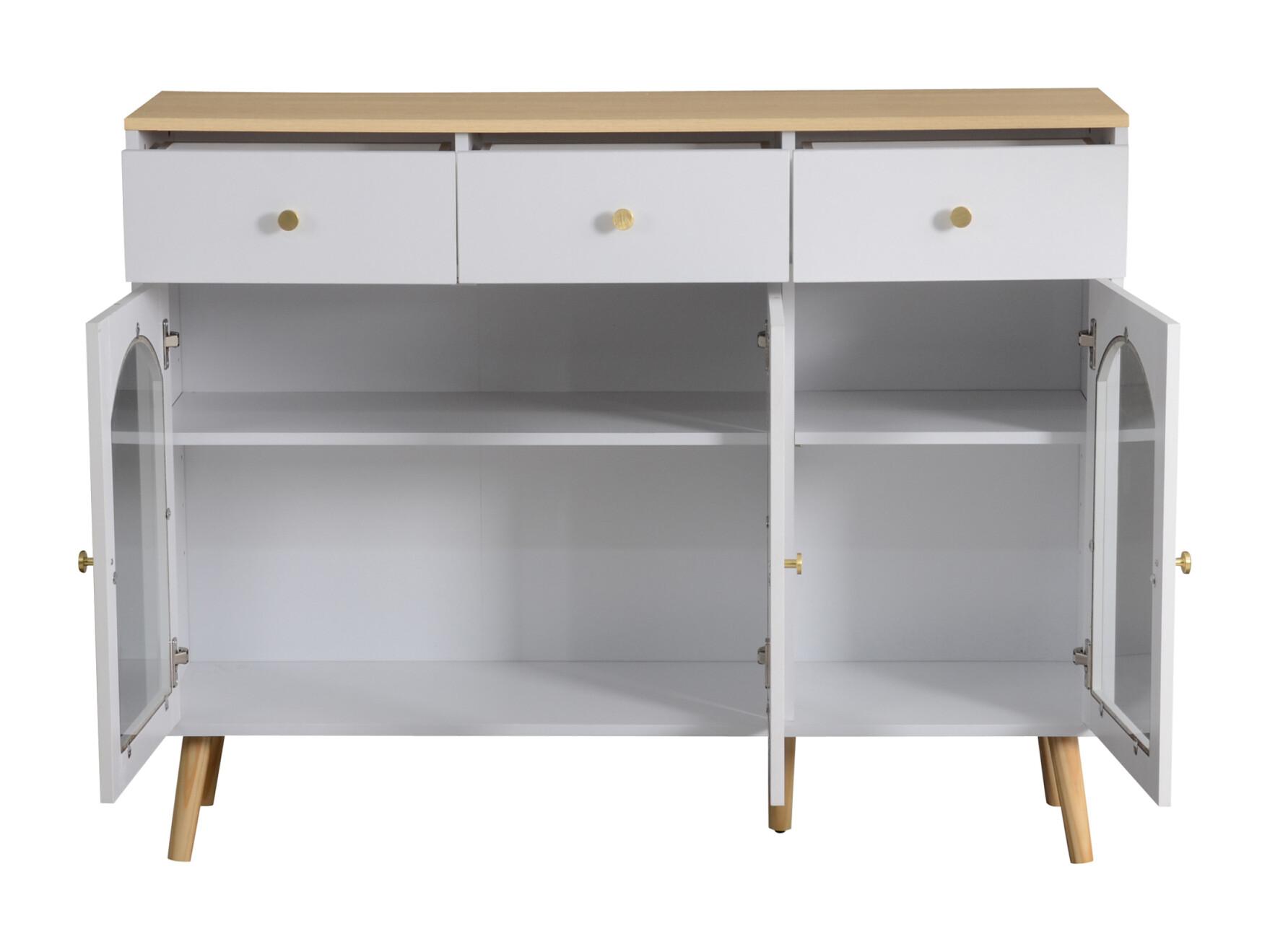 Aparador con 3 cajones y 3 puertas curvas en cristal templado, Cocina y Restaurante, 120x34x94, blanco