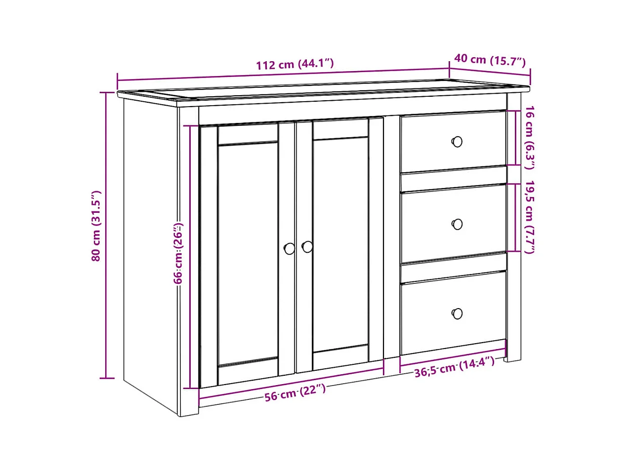 Aparador con cajones Panama madera maciza pino 112x40x80 cm