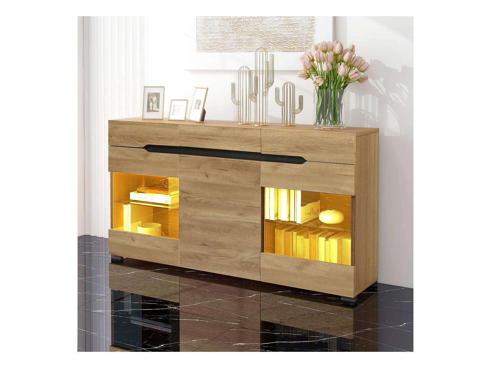 Aparador con iluminación LED, 3 puertas 3 cajones, color madera, para sala o comedor