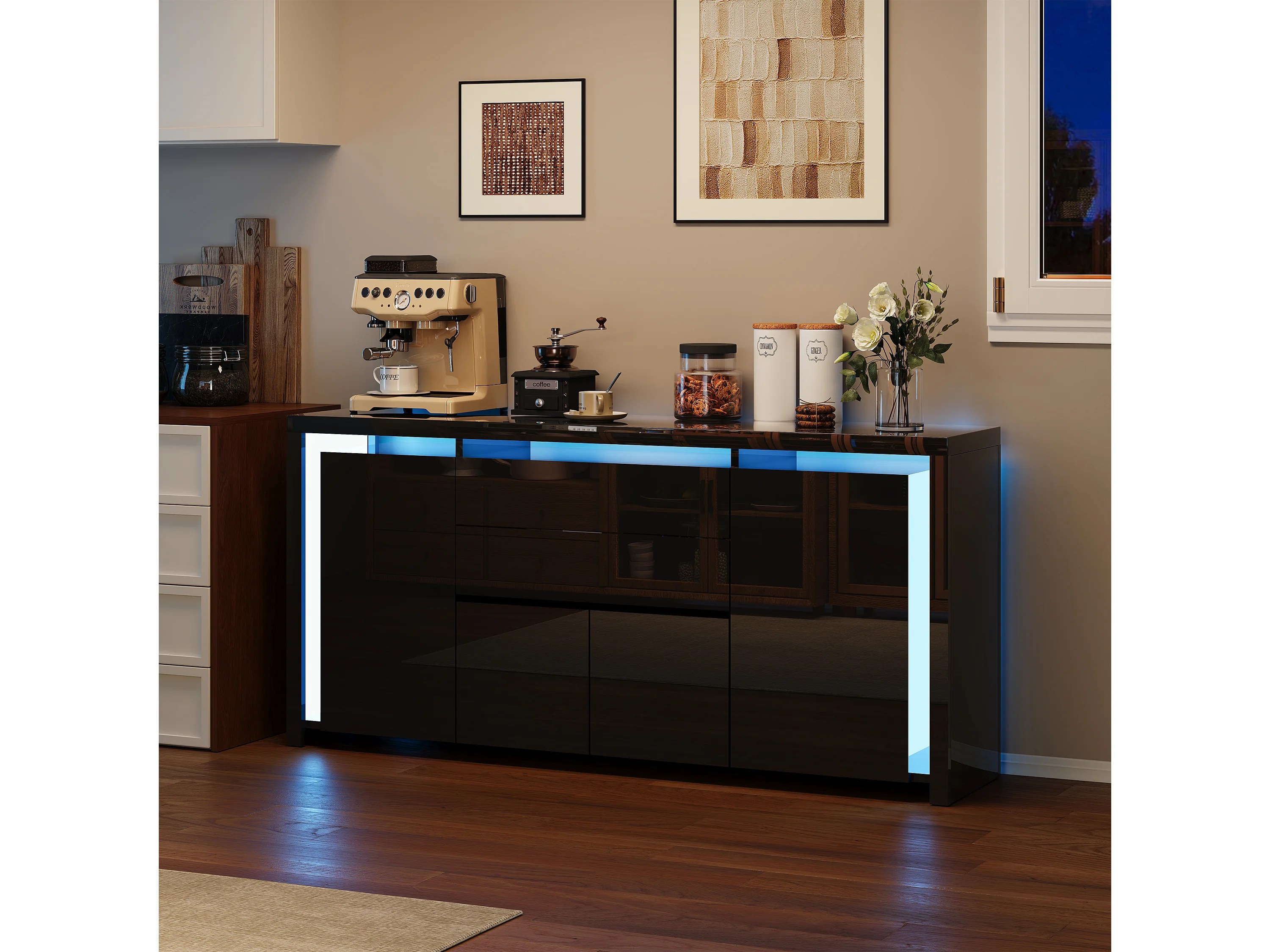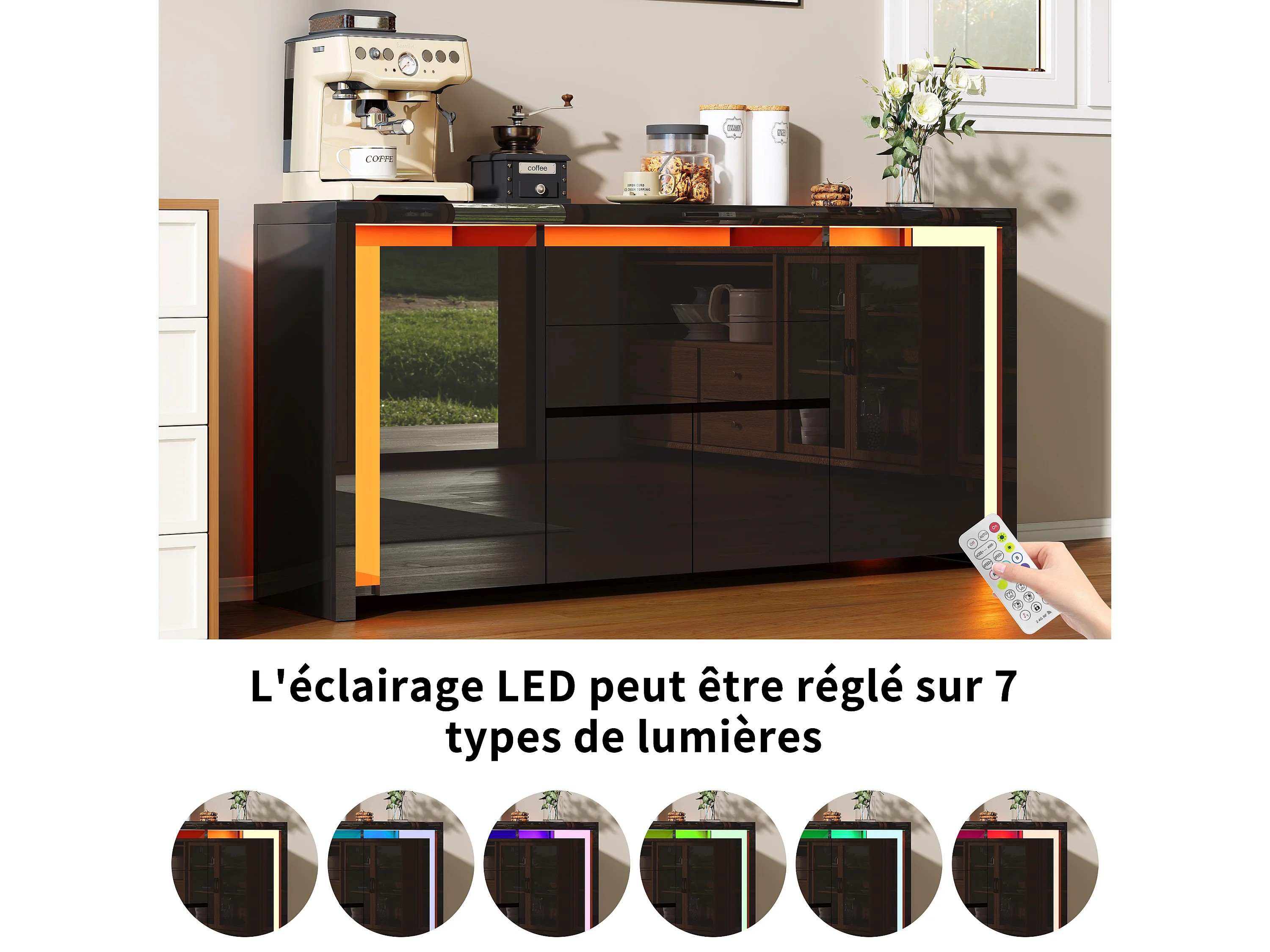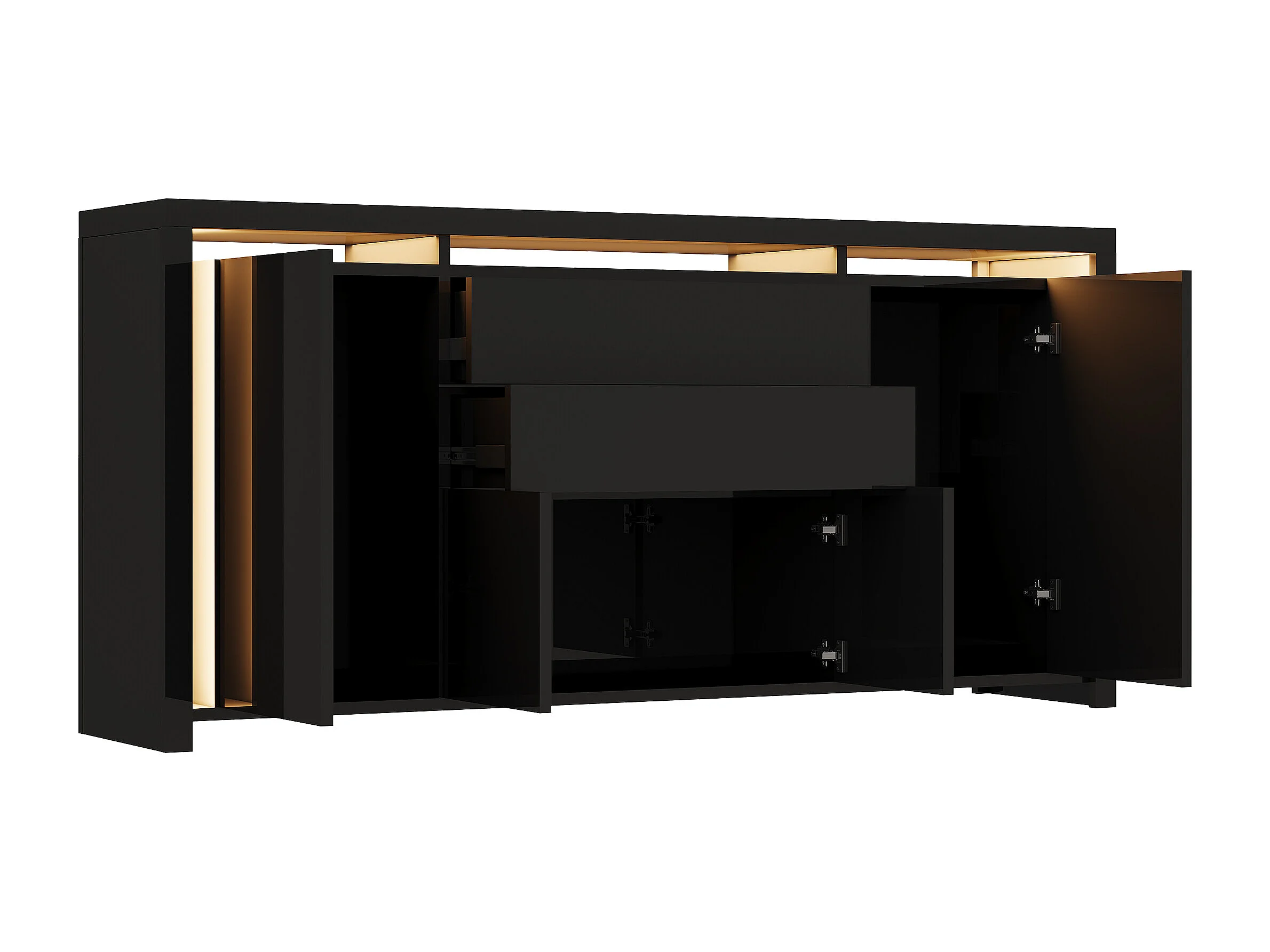 Aparador con iluminación LED y 2 cajones - Cómoda de 4 puertas con compartimentos - Mueble de almacenaje - Mueble de cocina/salón - Negro