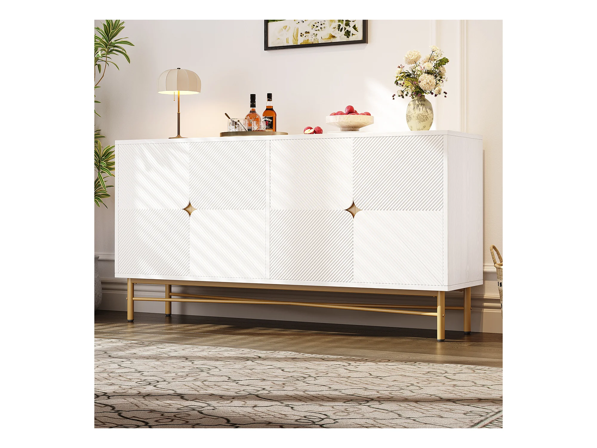 Aparador con textura gofrada, 4 puertas, tiradores dorados y patas lacadas, blanco (160x40x82 cm)