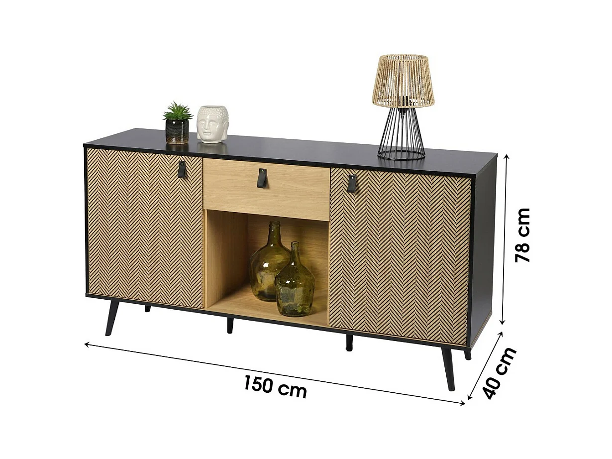 Aparador de 2 puertas, 1 cajón y un hueco – Estilo diseño, dimensiones 150x40x78 cm, colores roble claro y negro.