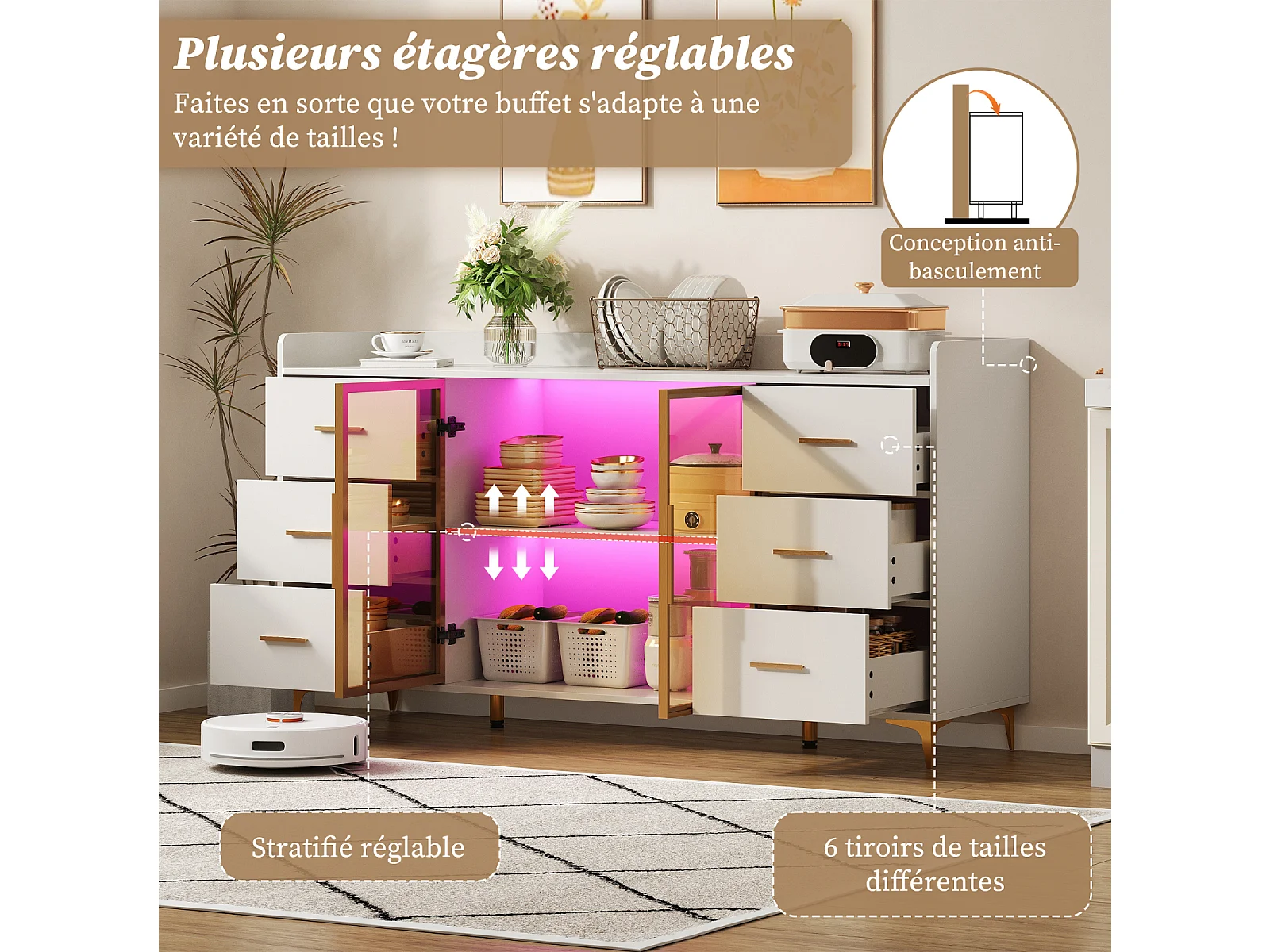 Aparador de cocina con LED, 6 cajones, puertas de cristal ámbar, mueble de almacenaje, color oro blanco