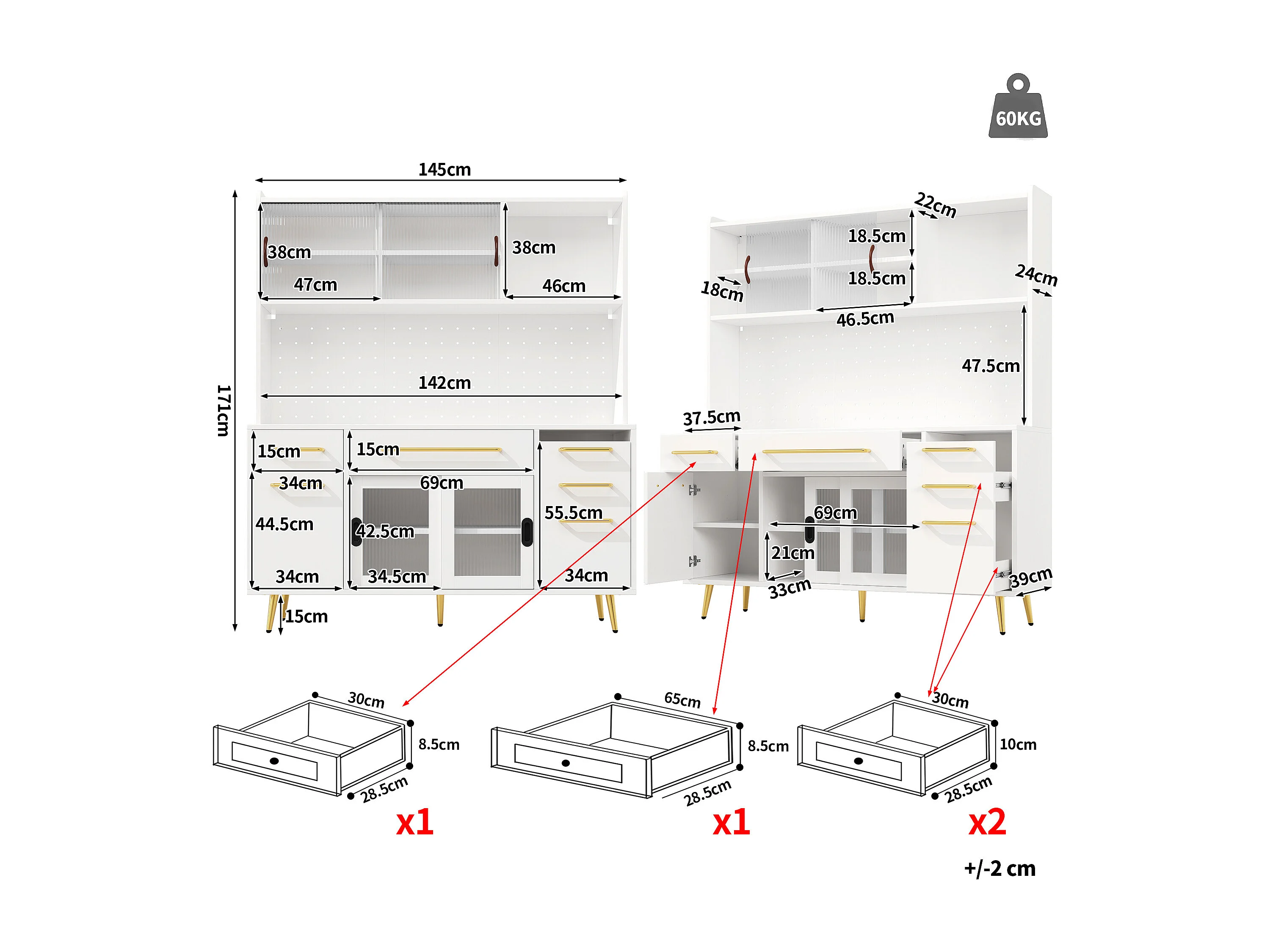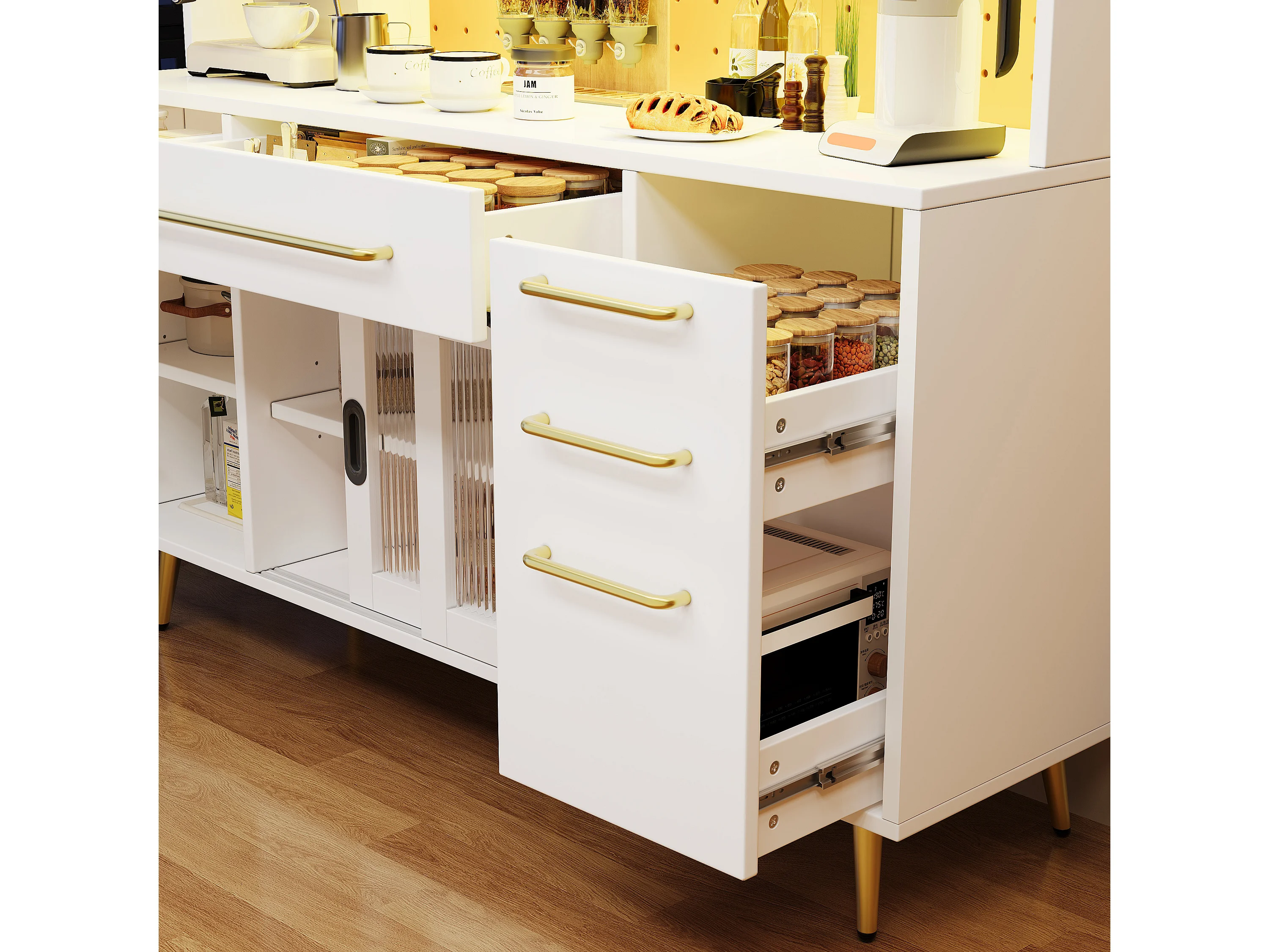 Aparador de cocina moderno - 145 x 39 x 171 cm - con puertas + LED + cajones + estante de cristal - MDF + cristal - blanco