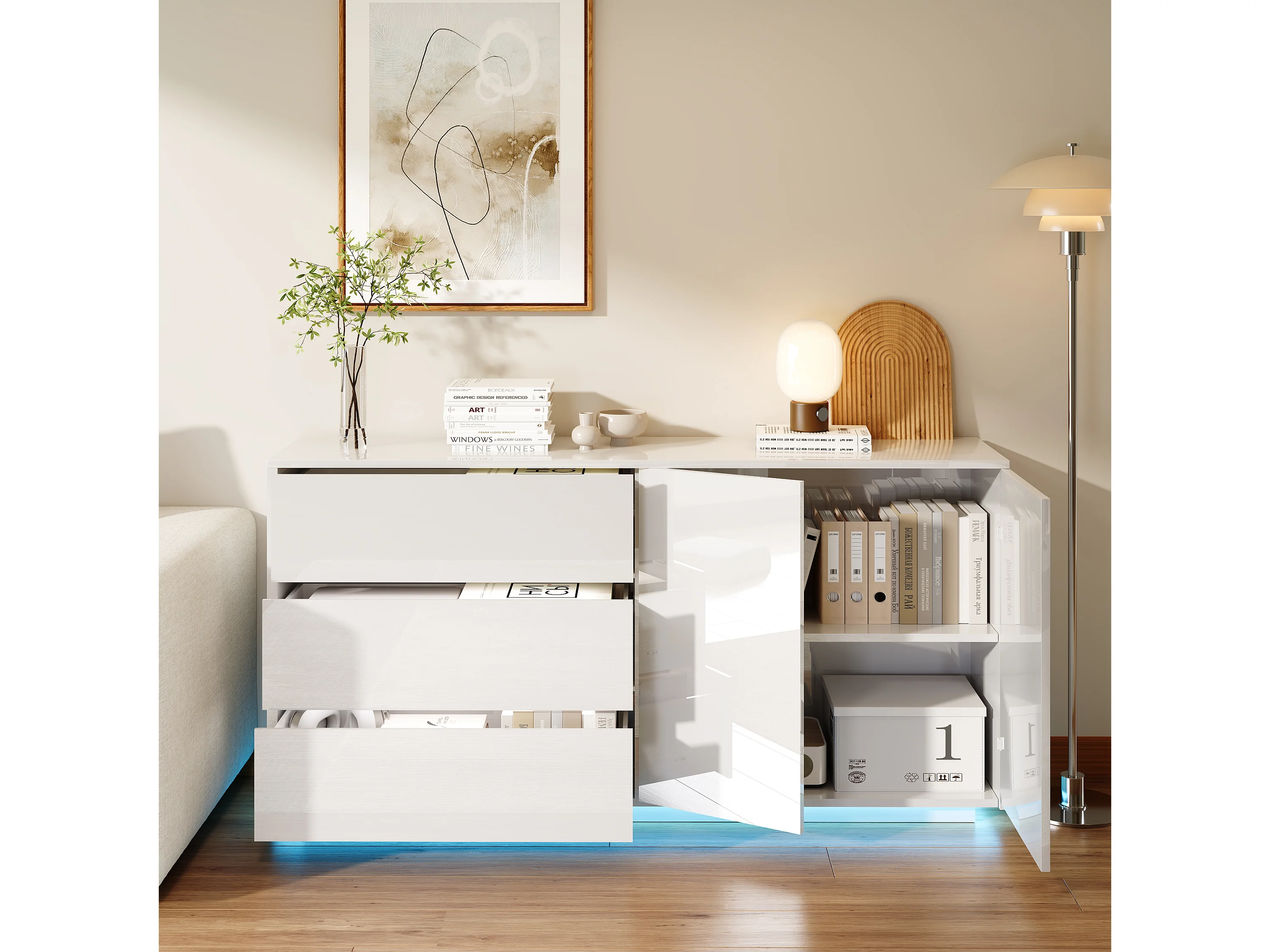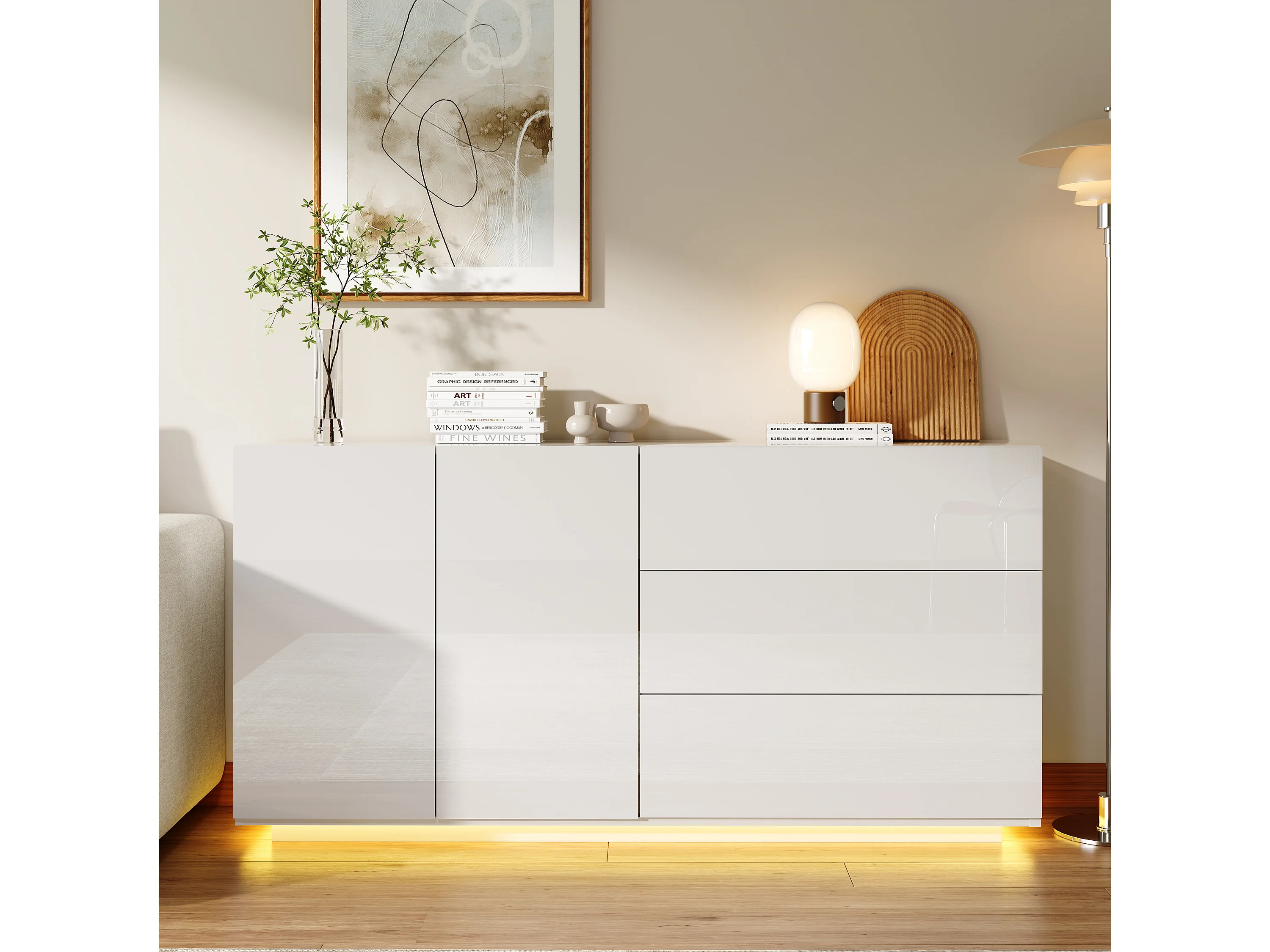 Aparador de cocina/sala de estar de 160 x 35 x 76 cm, con iluminación LED, 2 puertas, color blanco.