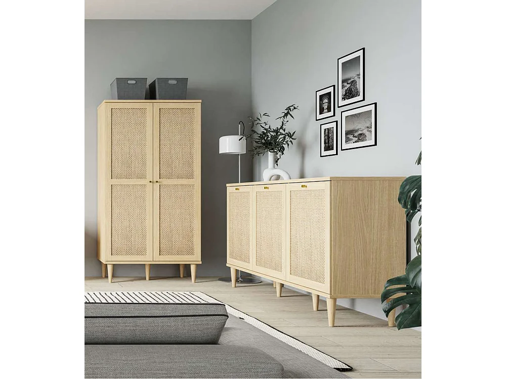 Aparador para salón comedor de 110x80x40 cm con 2 puertas y frentes de ratán beige Camile