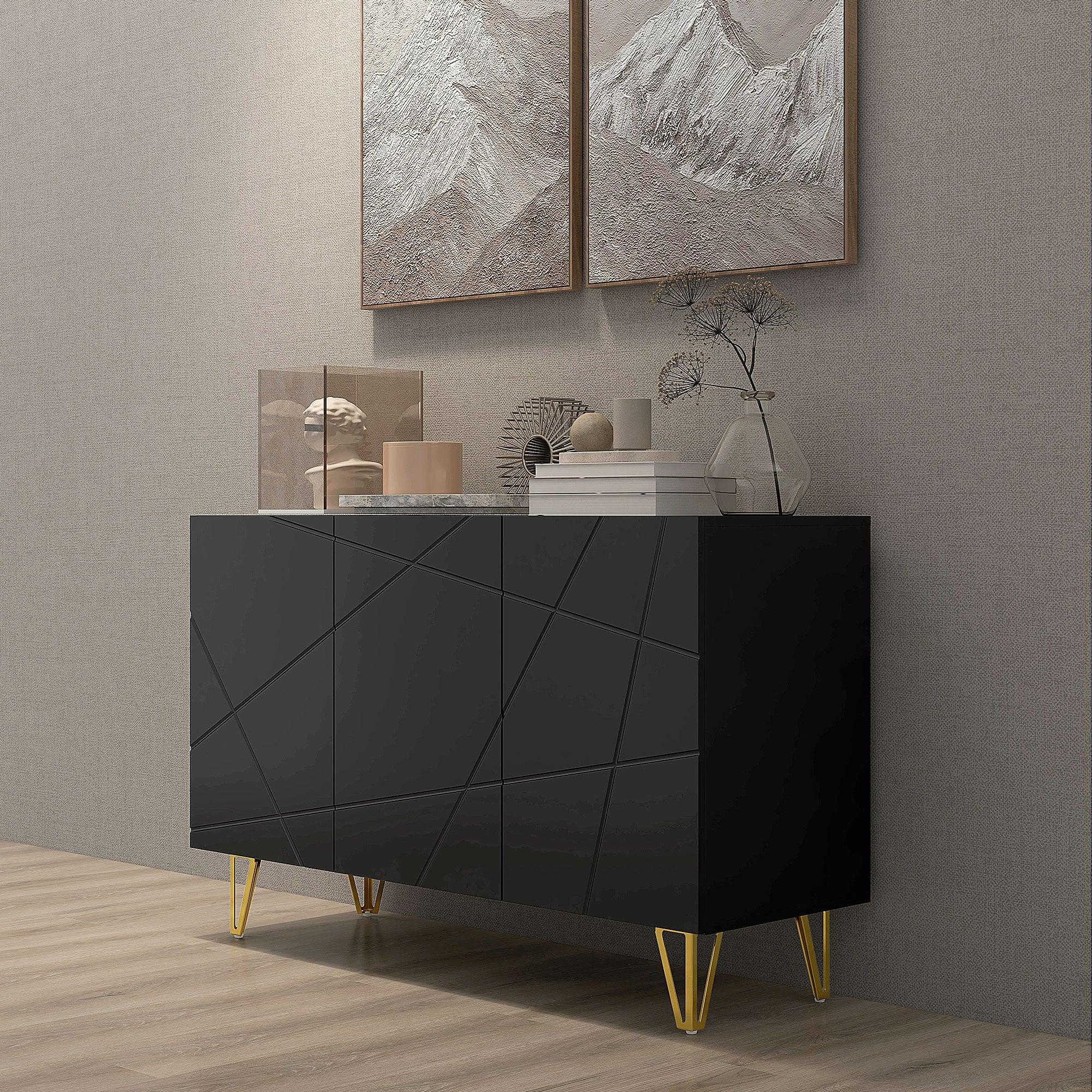 Dale un toque de elegancia y orden a tu hogar con el aparador Desiré de Homcom. Con un diseño moderno y sofisticado, este mueble destaca por sus puertas de alto brillo con relieves geométricos y unas patas doradas en forma de horquilla que añaden un toque elegante. Ideal para entradas, salones o incluso dormitorios, combina estilo y funcionalidad en un solo mueble. Cuenta con dos amplios compartimentos con estantes ajustables en 3 posiciones, para que puedas guardar desde vajilla y libros hasta ropa o accesorios del día a día. Las puertas se abren suavemente gracias a sus bisagras amortiguadoras, evitando portazos y ofreciendo un cierre silencioso. La encimera superior también se puede aprovechar para decorar con lámparas, jarrones o marcos de fotos.