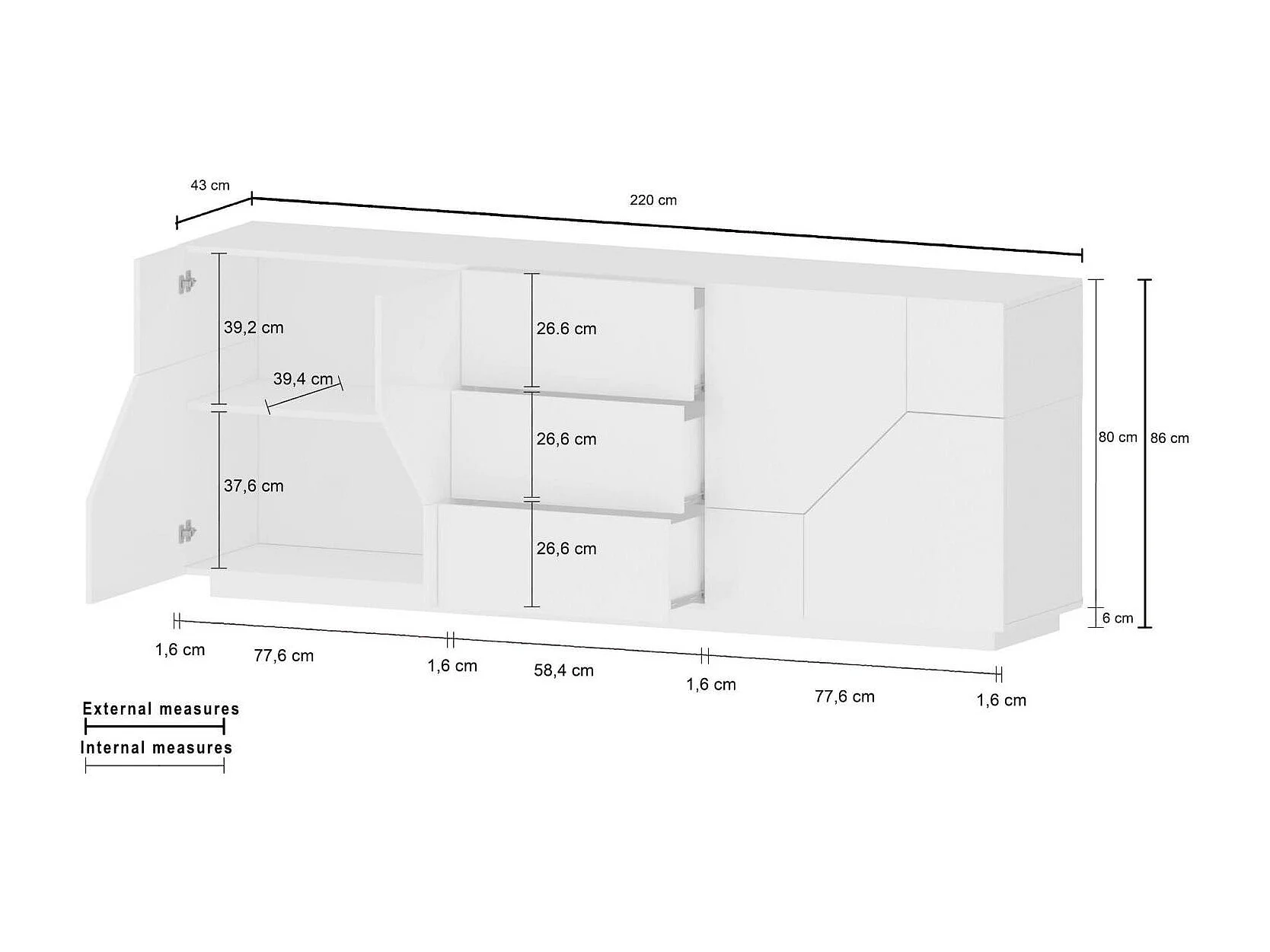 Aparador Dmazz, Aparador de cocina con 4 puertas y 3 cajones, Buffet de salón, 100% Made in Italy, cm 220x43h86, Blanco brillo y Arce