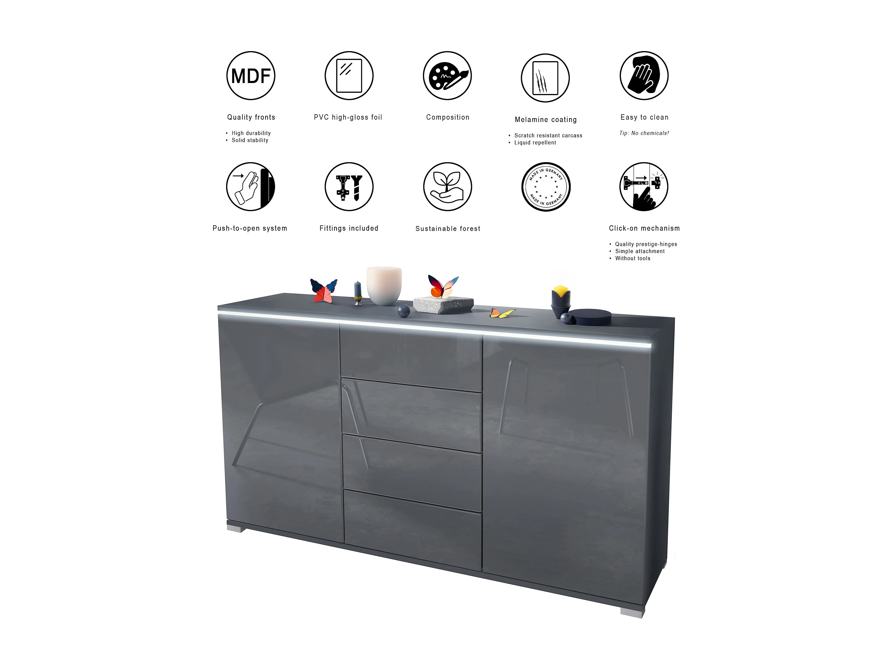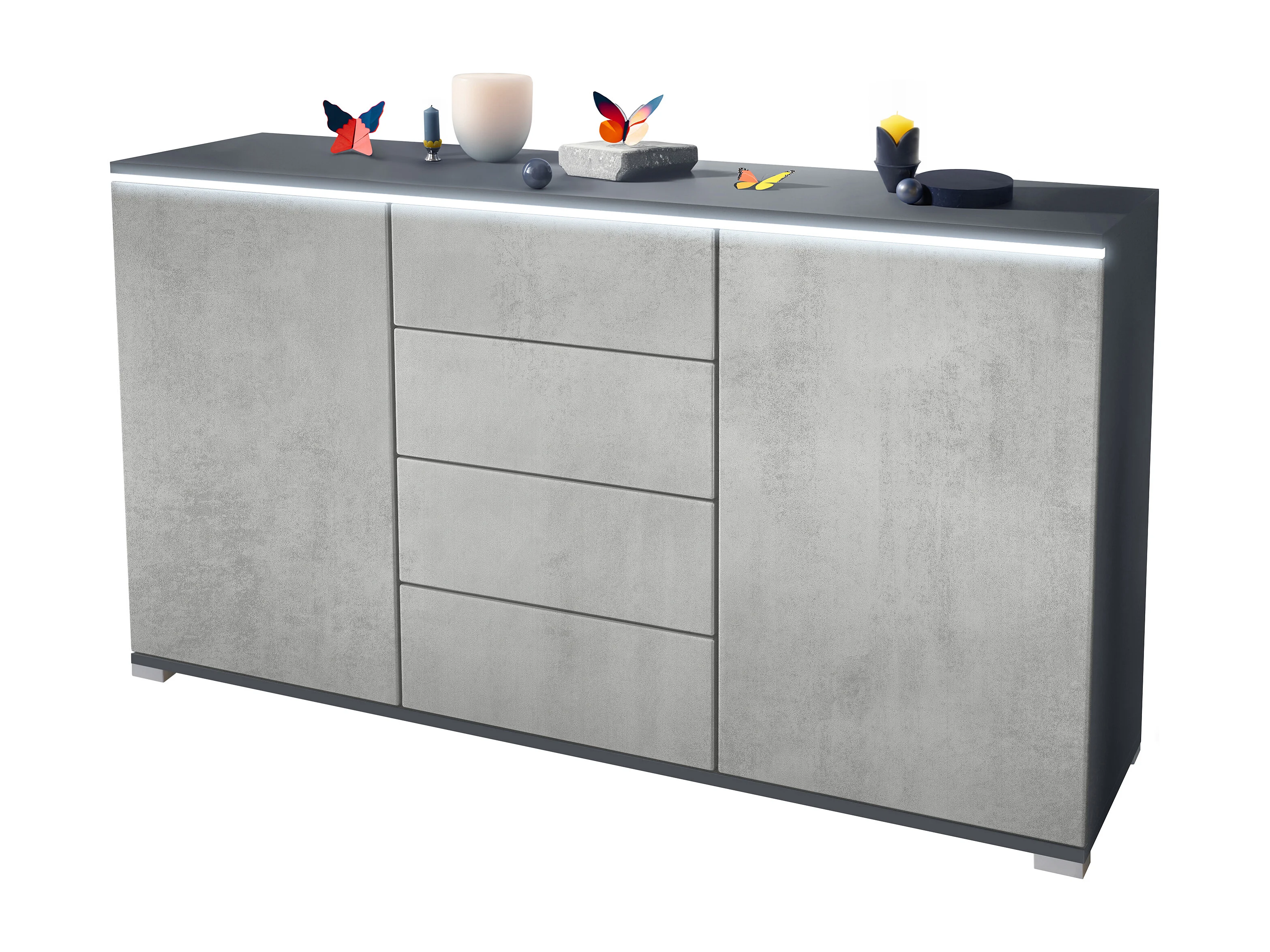 Aparador Faro V1 – Mueble con 2 Puertas y 4 Cajones, Armario con Tira de Luz LED, antracita mate / hormigón oxidado (138,5 x 75,5 x 35)