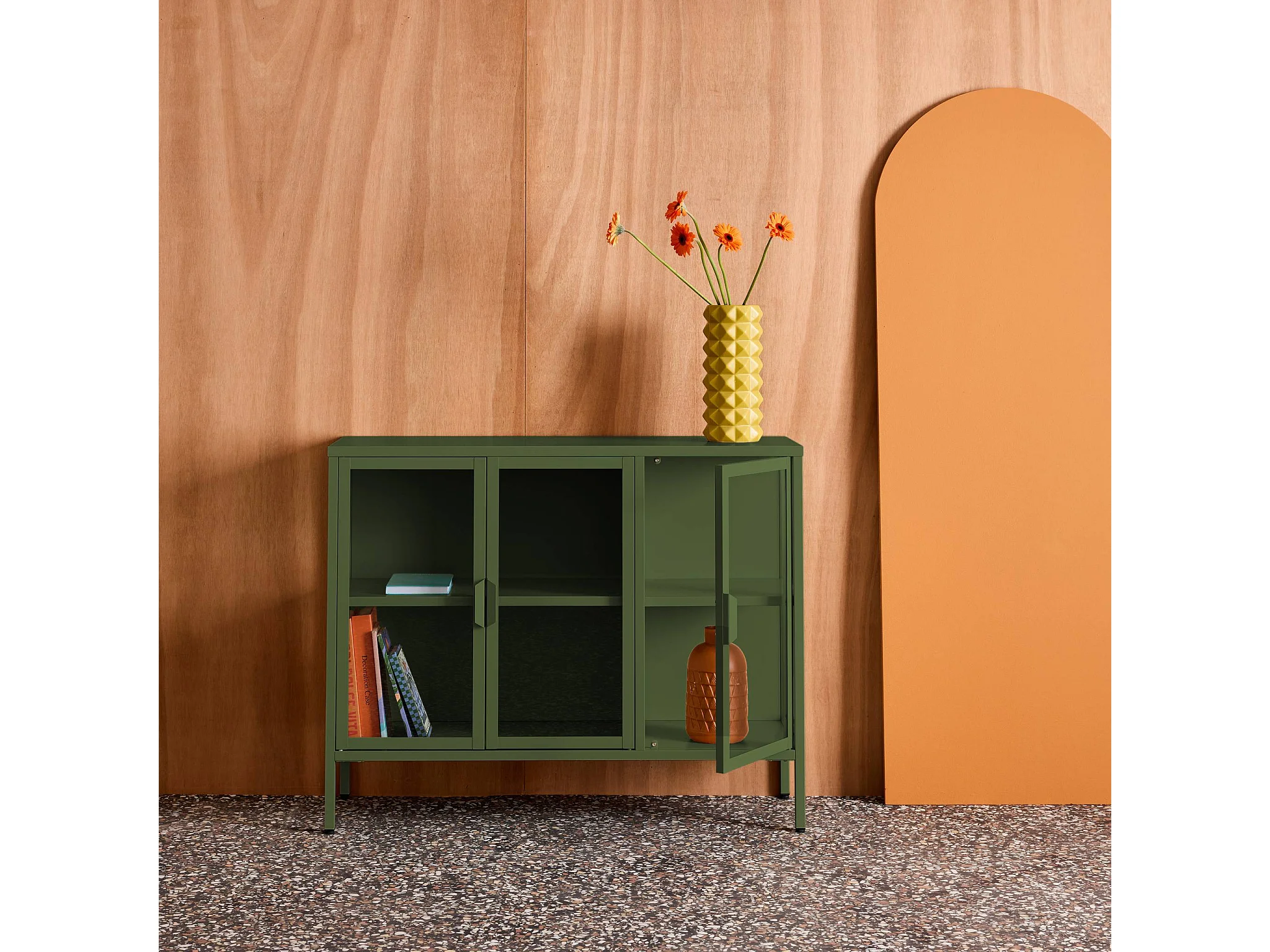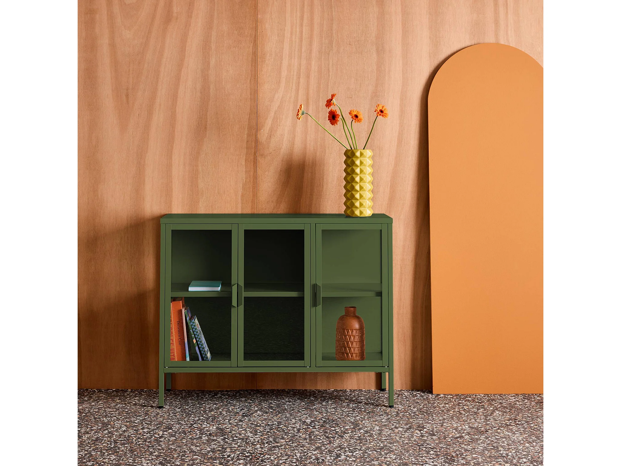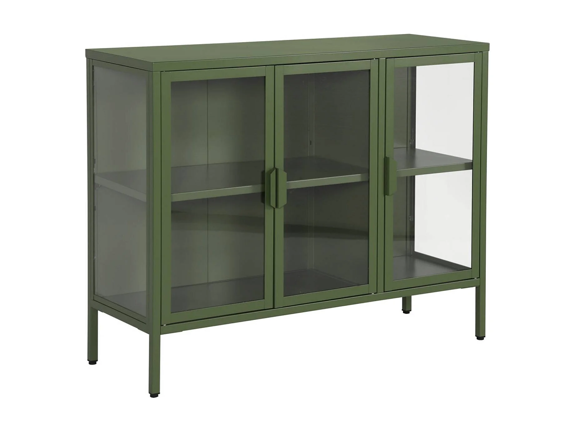 Aparador industrial de metal y vidrio templado 3 puertas, 100cm