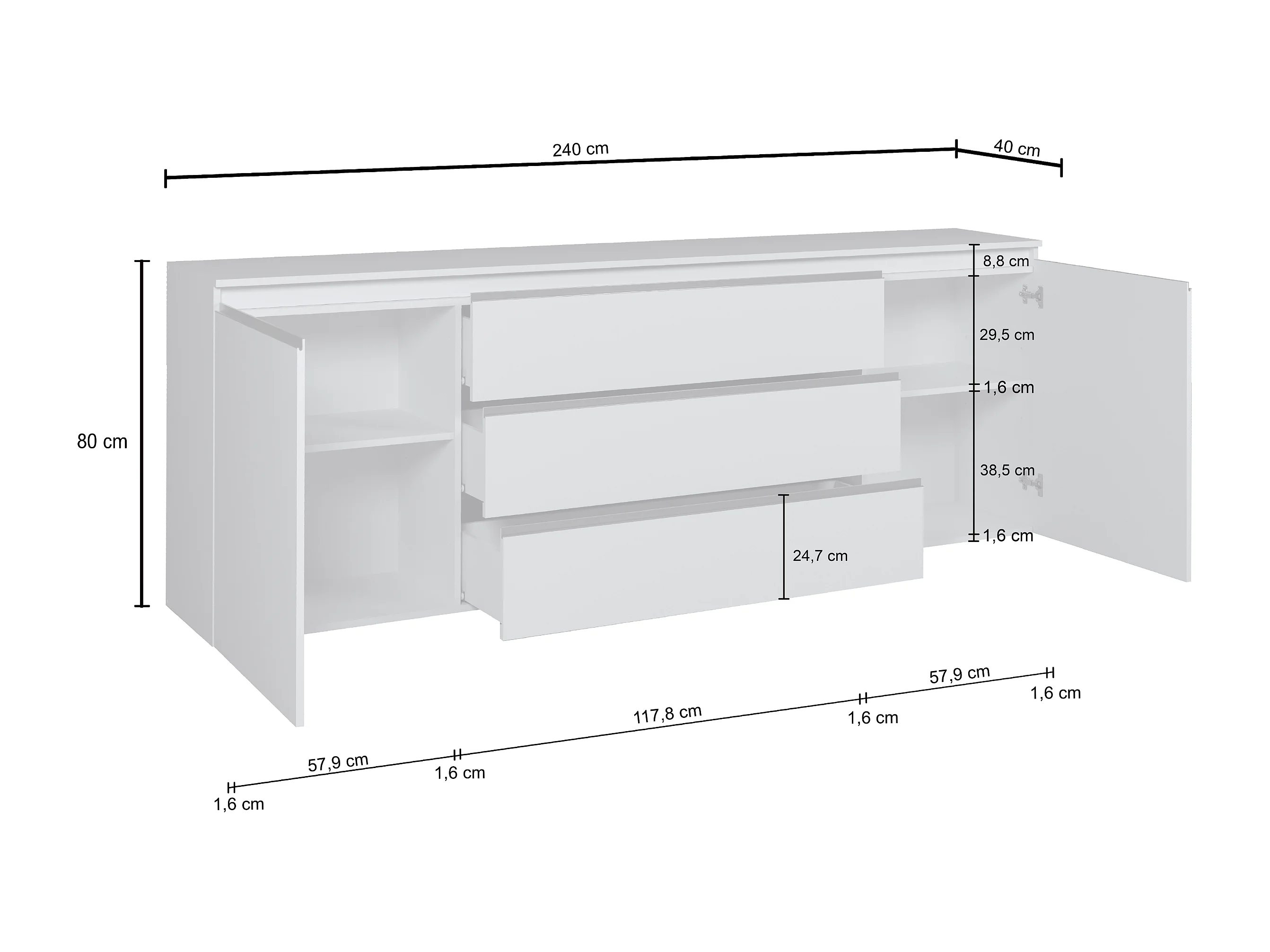 Aparador Magic con 2 puertas y 3 cajones blanco brillo 240x40x80 cm