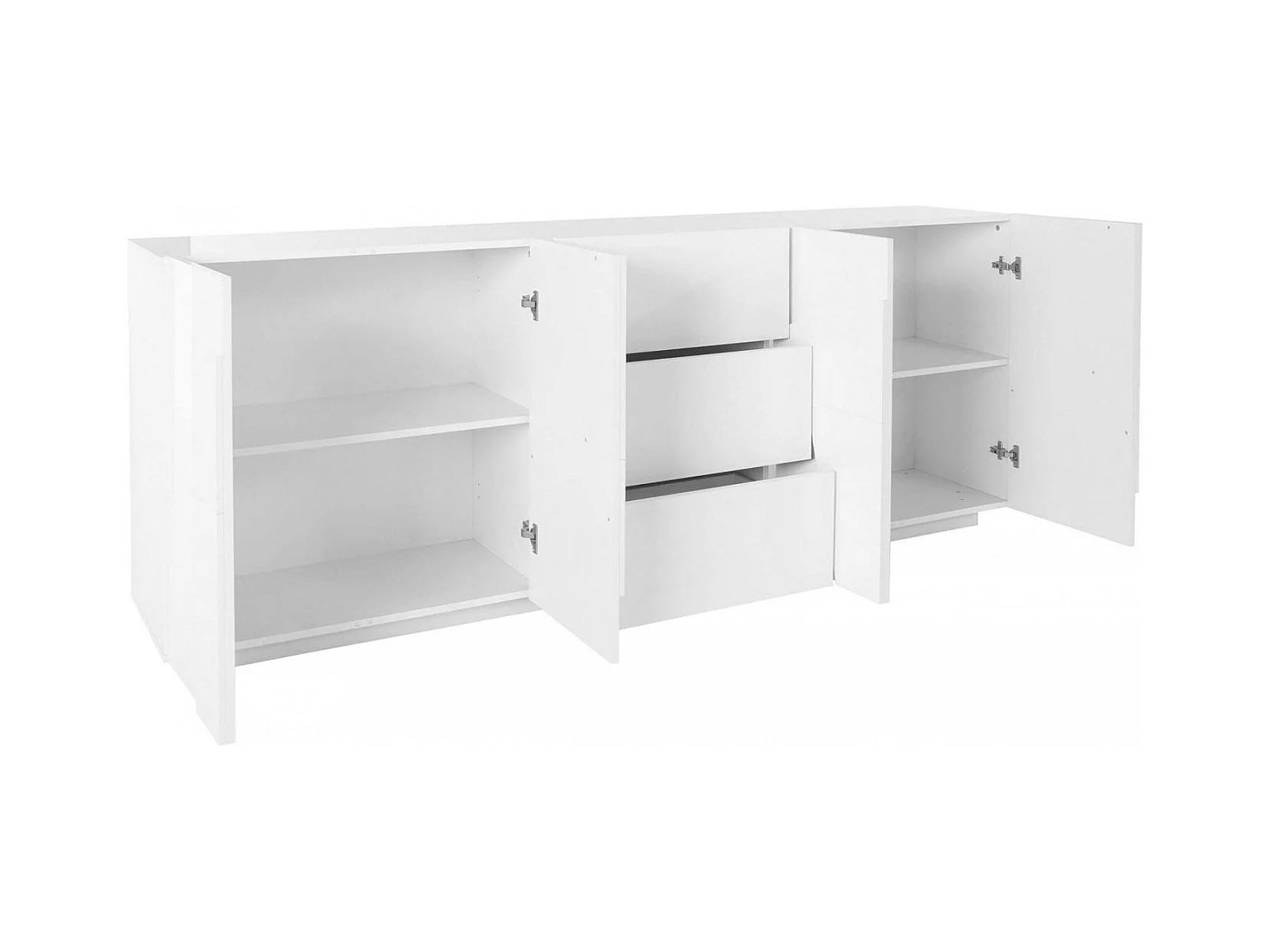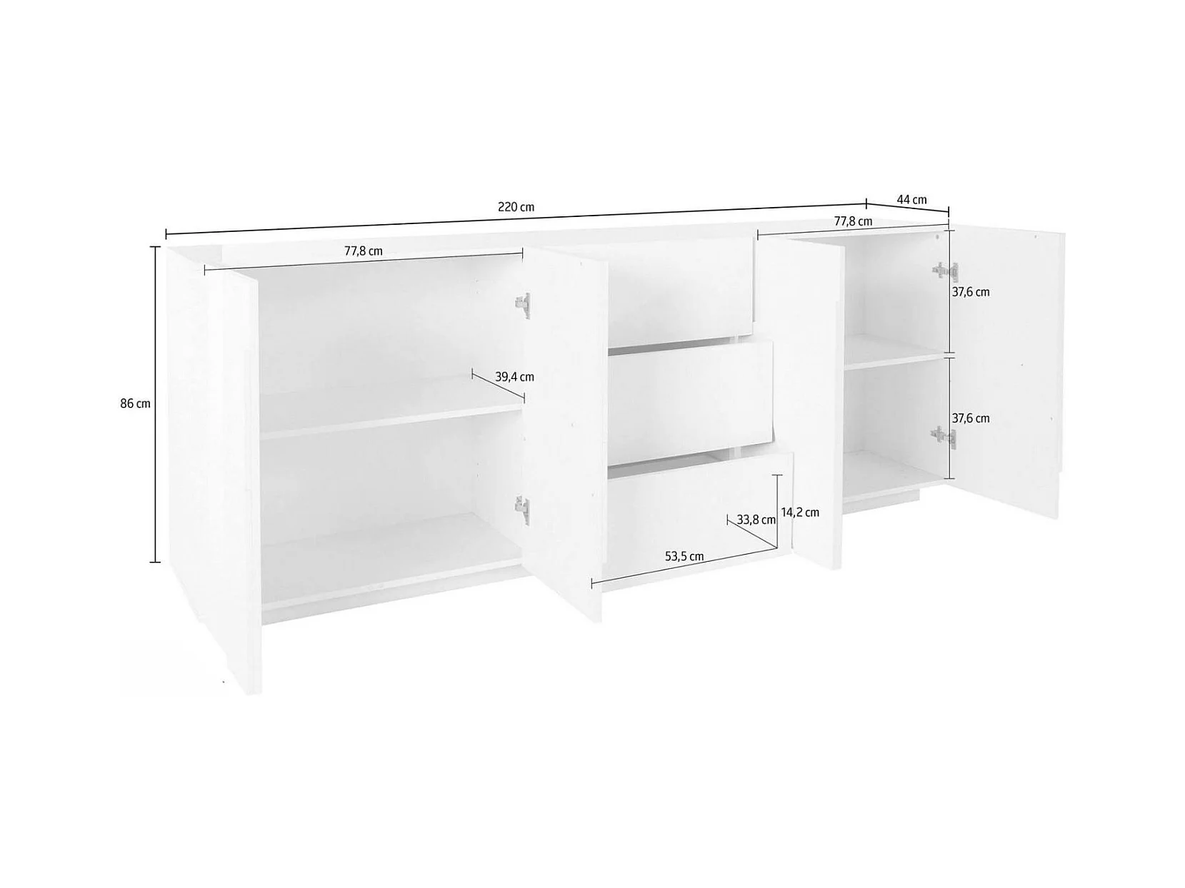 Sven Aparador, Aparador de cocina con 4 puertas y 3 cajones, Buffet de salón, 100% Made in Italy, 220x43h86 cm, Blanco brillante