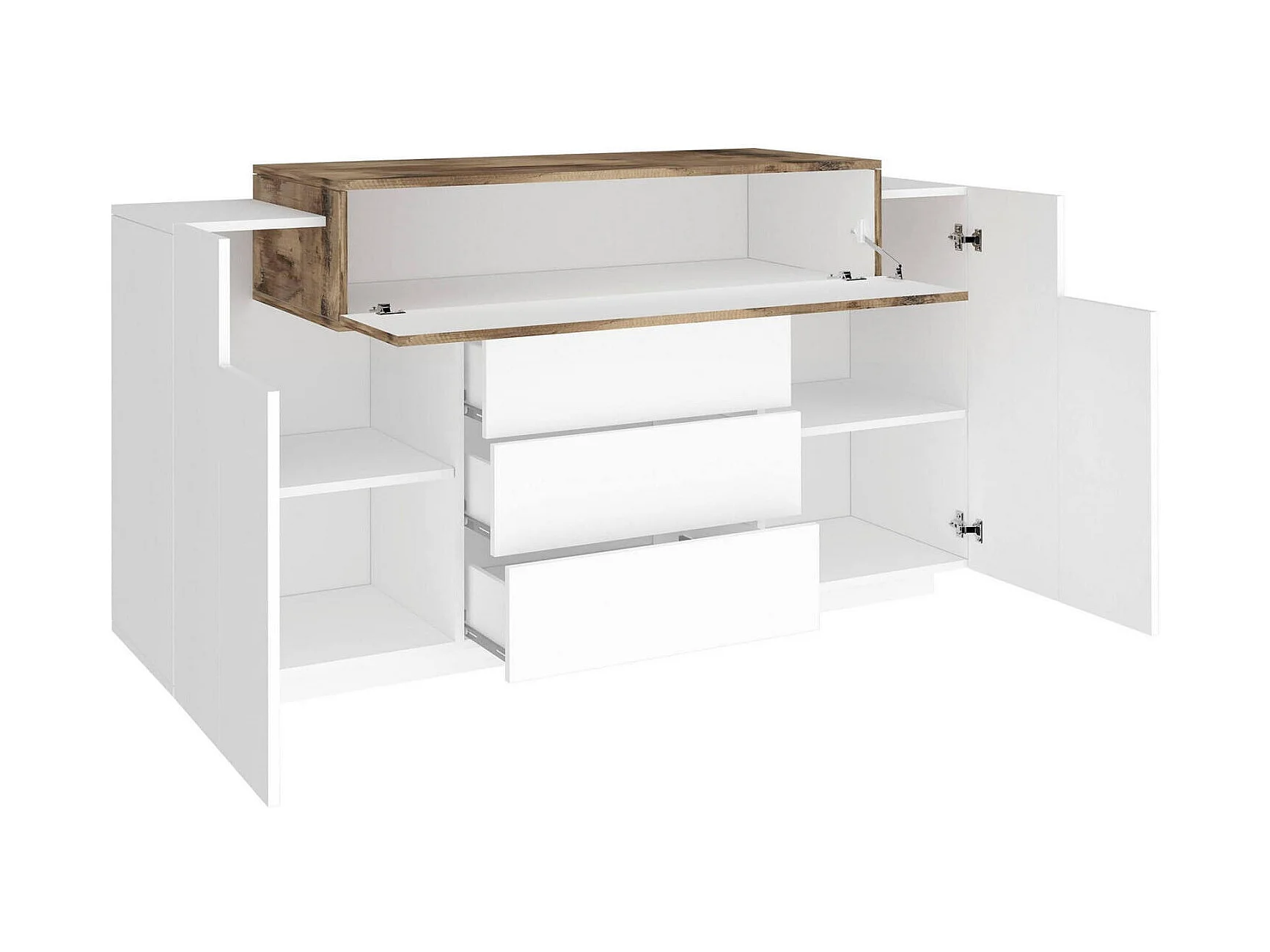 Aparador Milo, Aparador de cocina con 3 puertas y 3 cajones, Buffet de salón, 100% Made in Italy, 160x45h86 cm, Blanco brillo y Arce