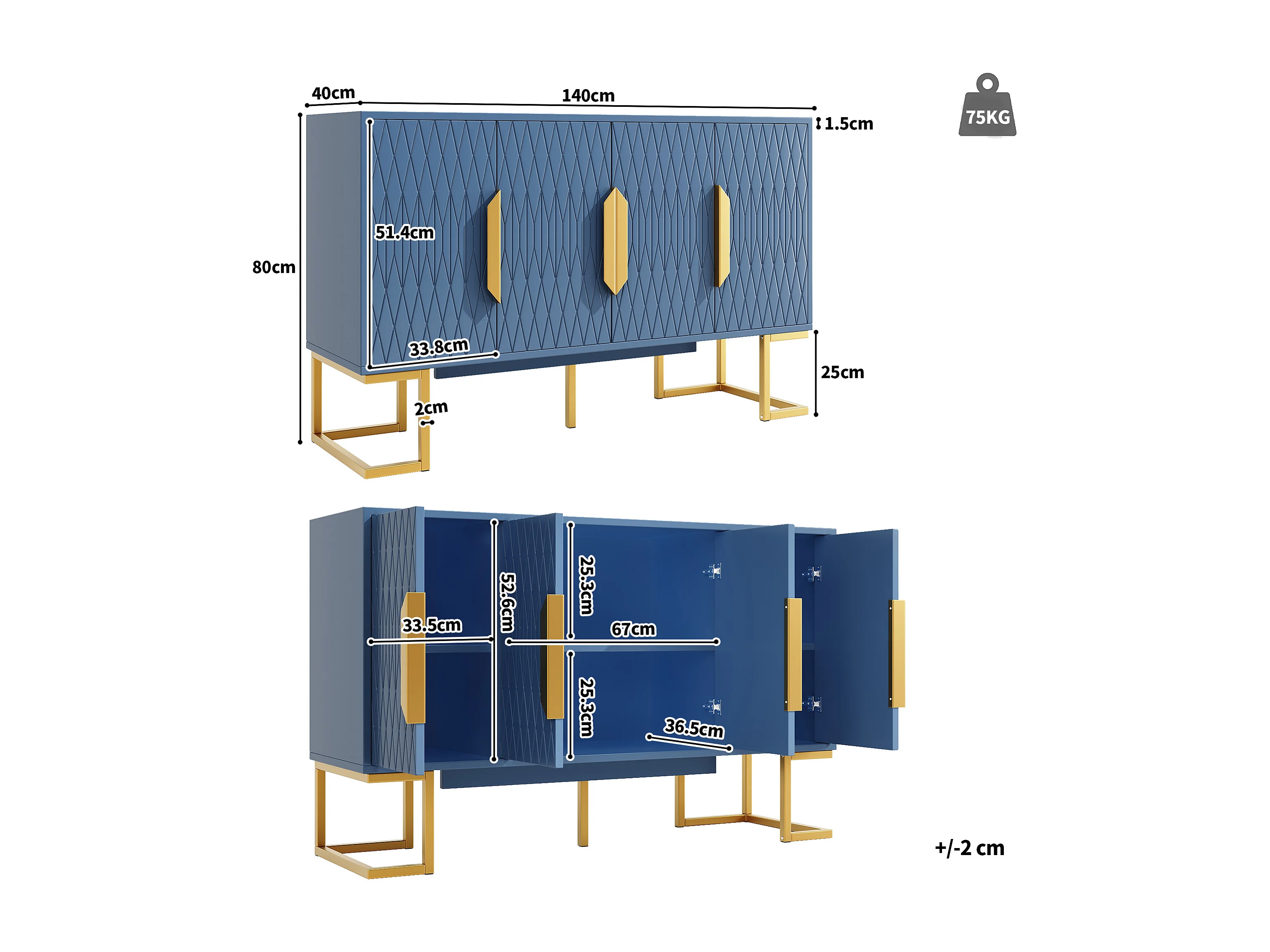 Aparador moderno - 140 x 40 x 80 cm - con 4 puertas y 2 estantes ajustables - patas doradas - MDF + metal - azul