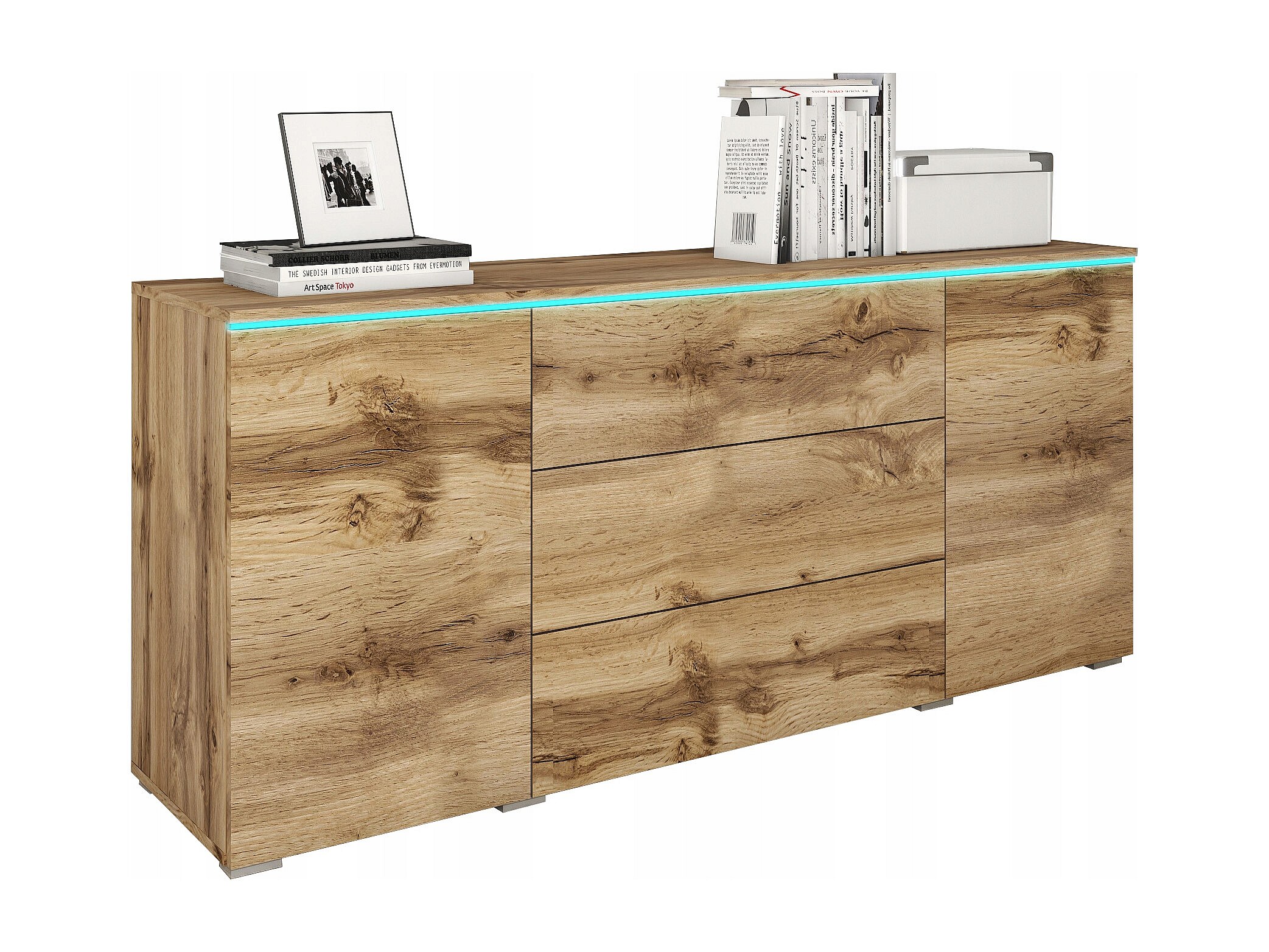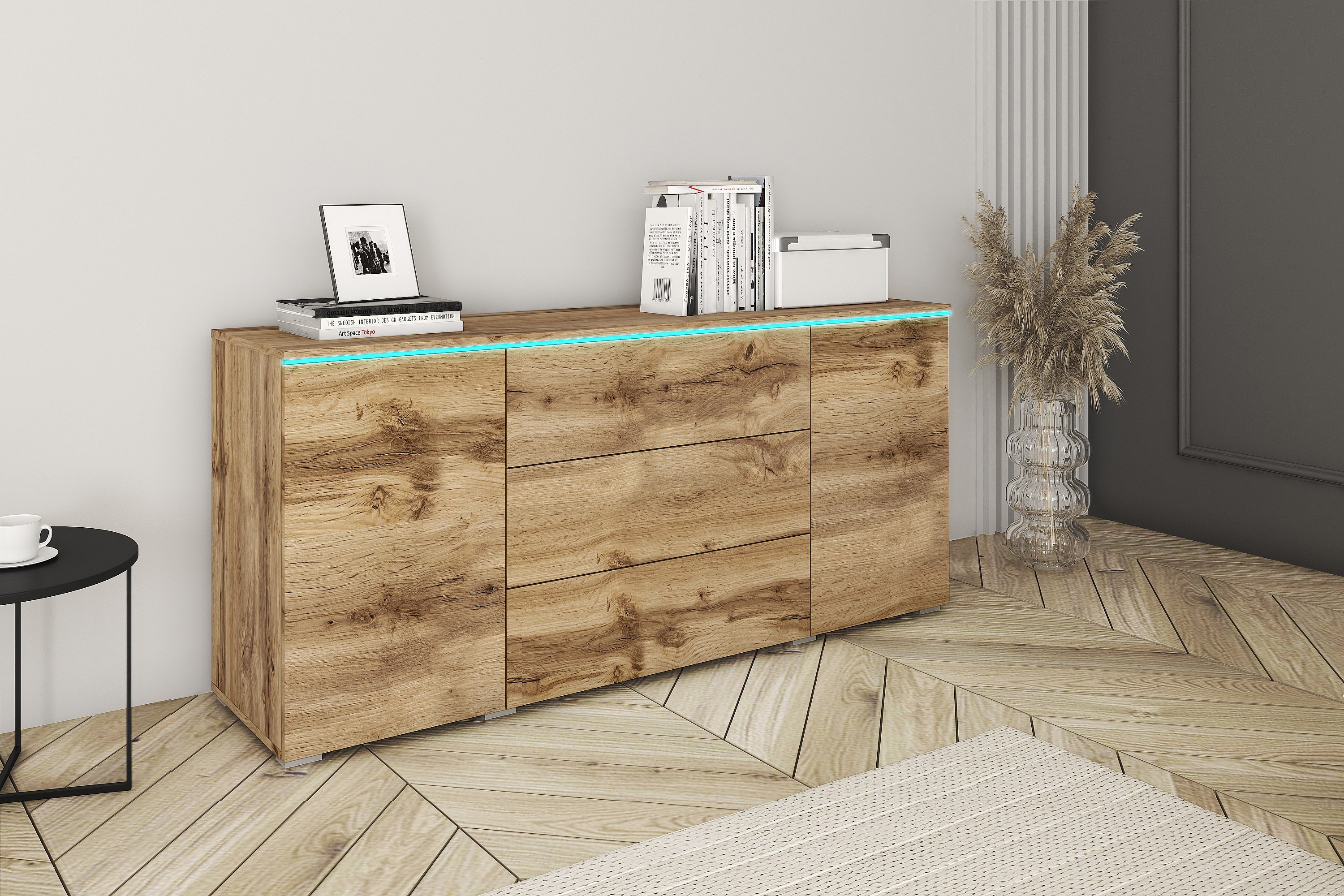 Aparador moderno 150 cm con LED para salón – acabado mate, 3 cajones y 2 puertas roble wotan