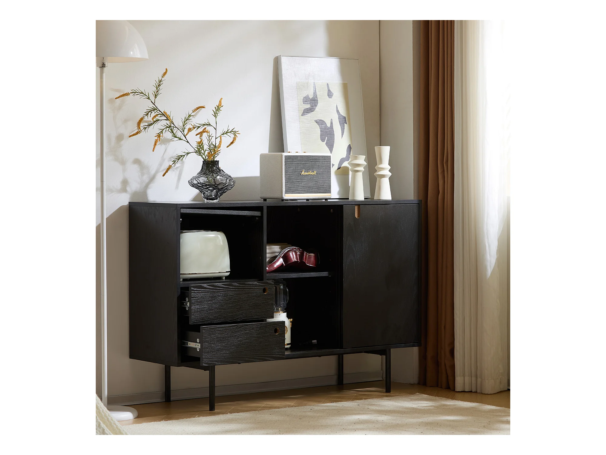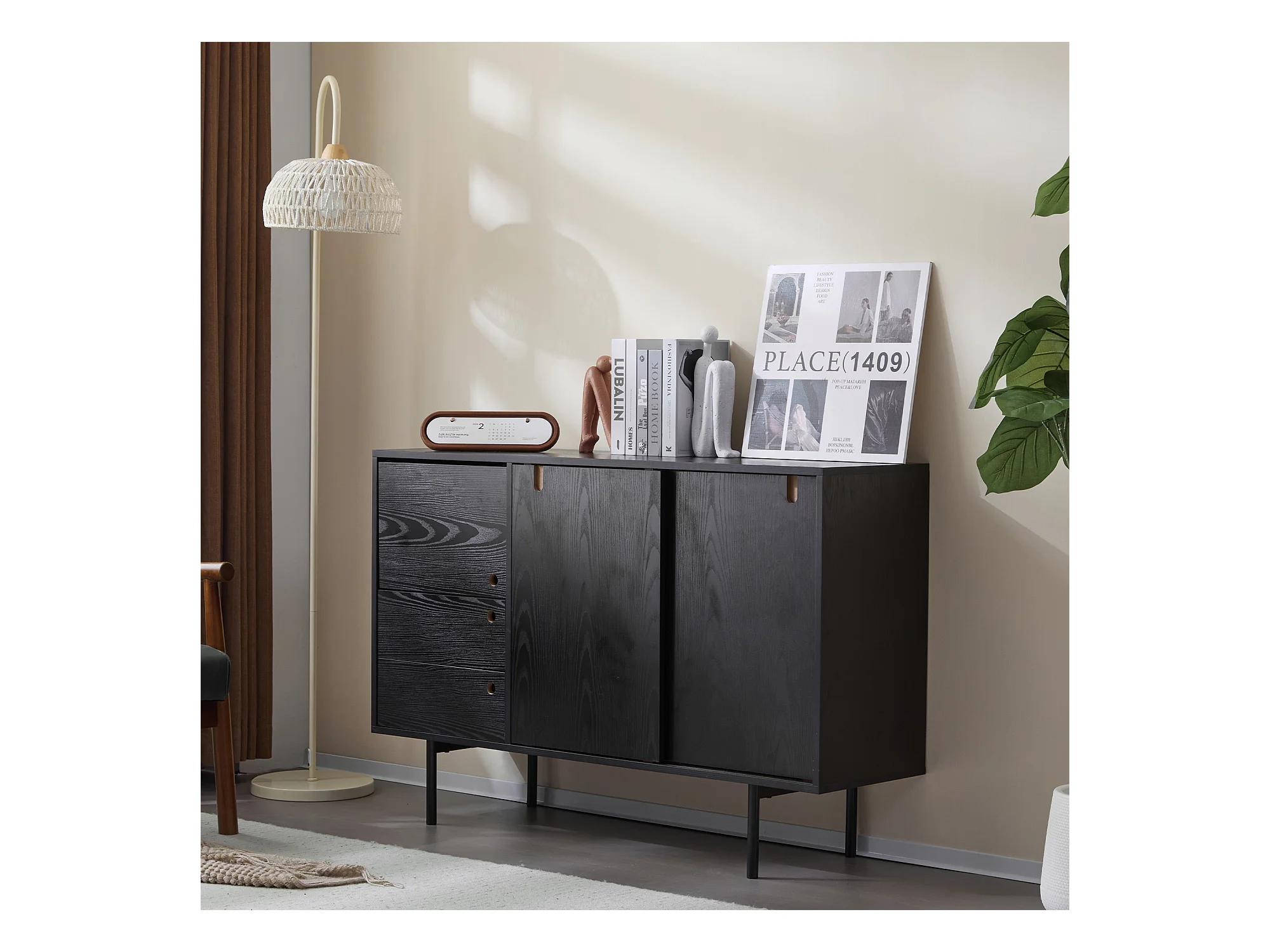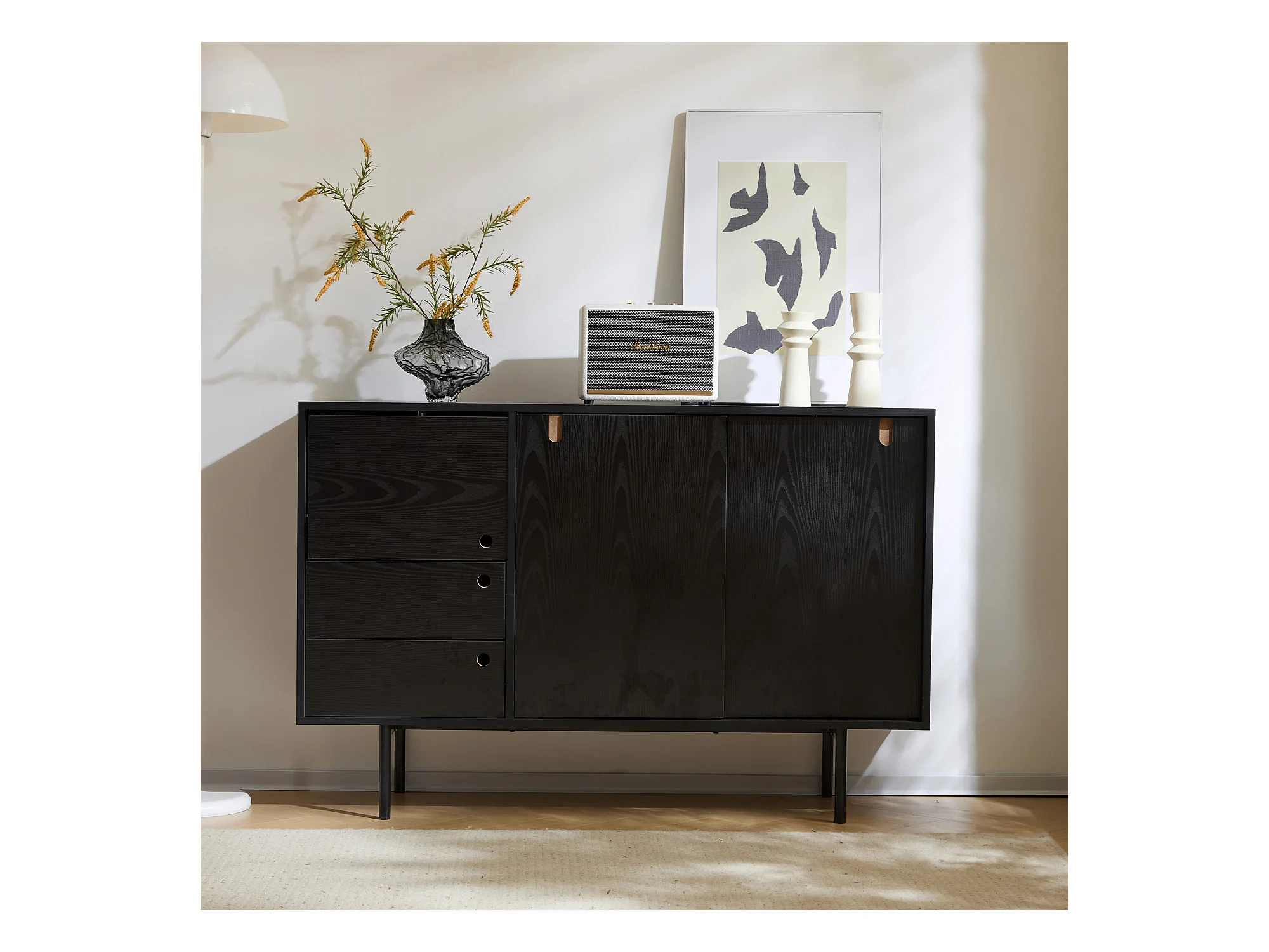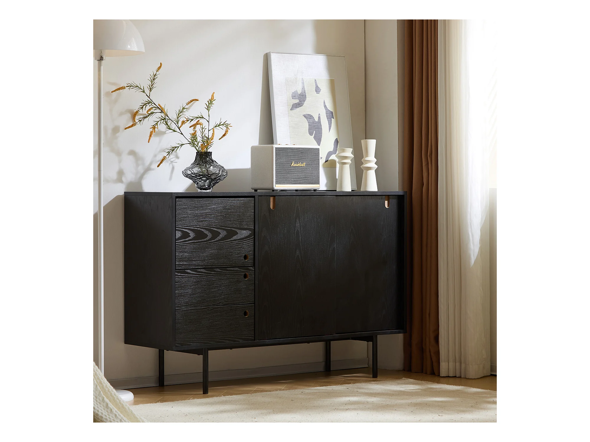 Aparador moderno con 2 cajones y 3 puertas - 120 x 35 x 78 cm - Tablero de partículas y metal - Negro