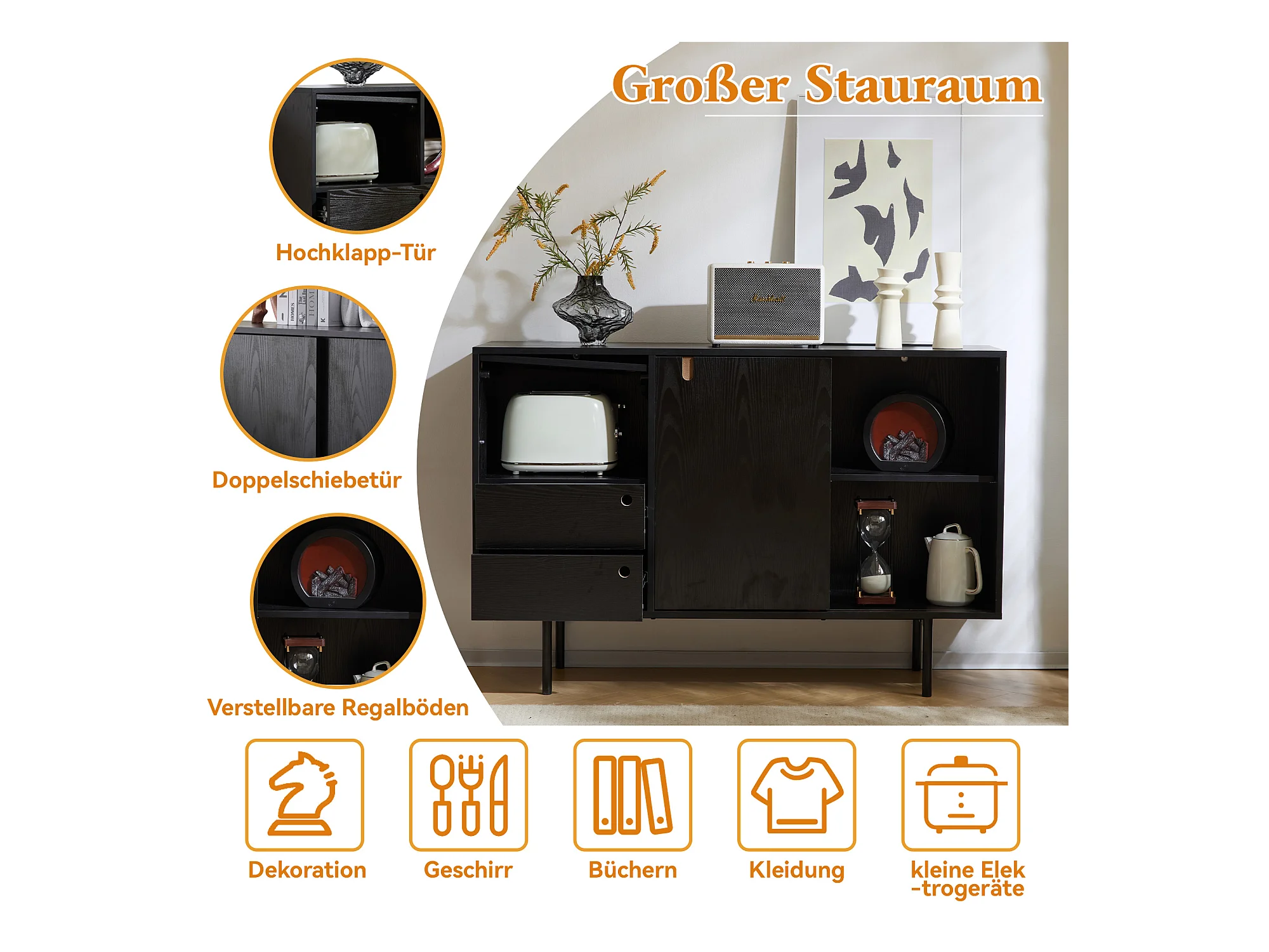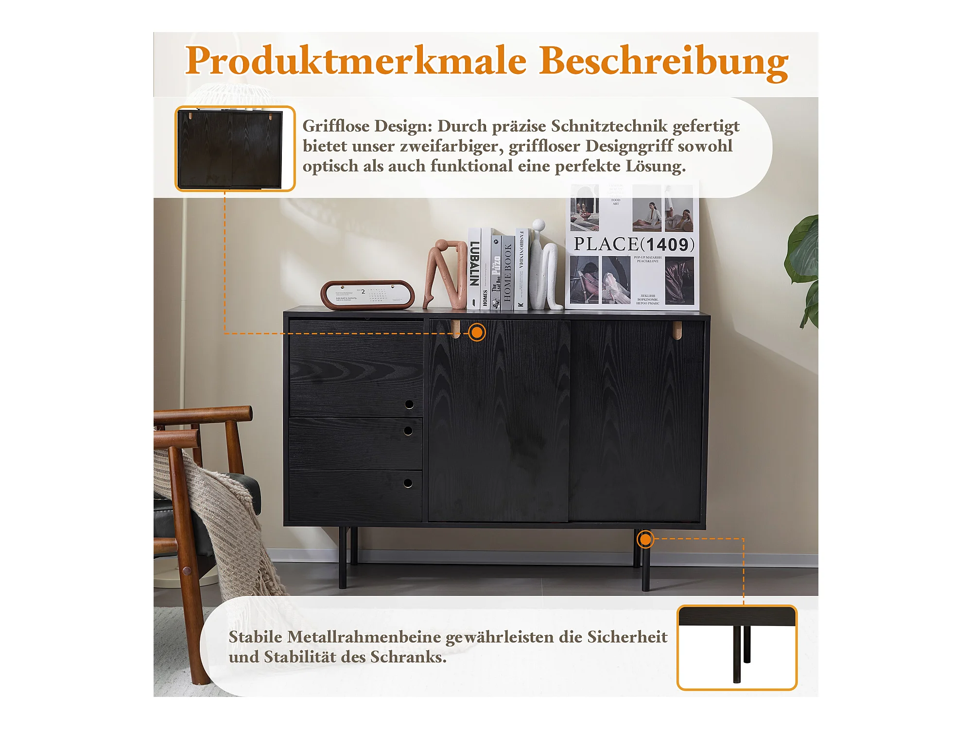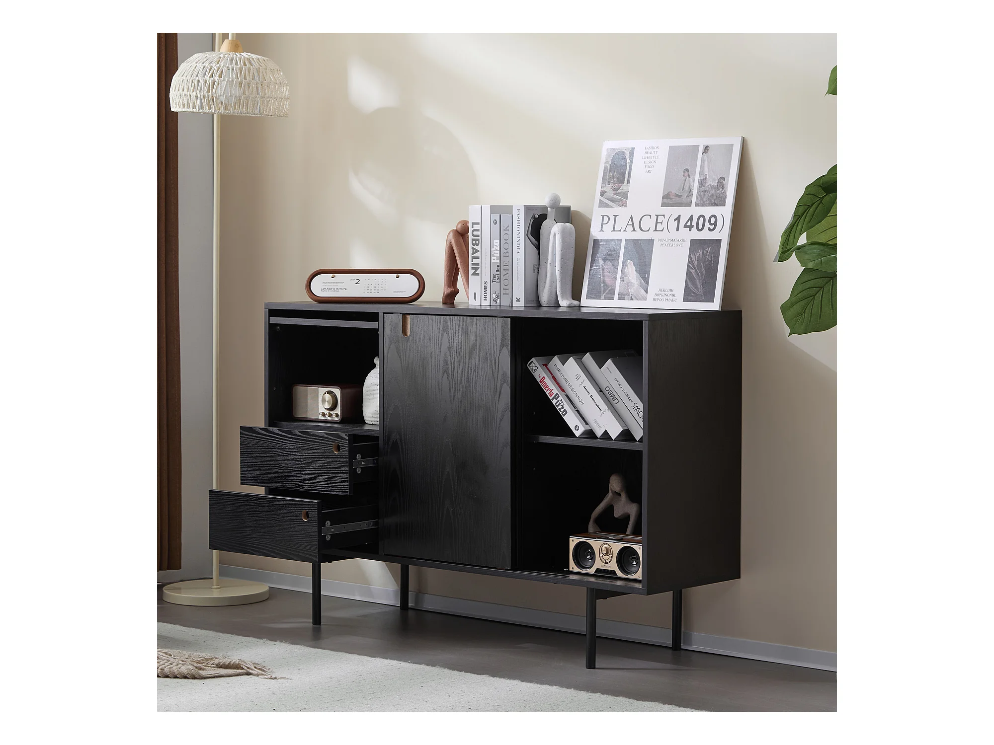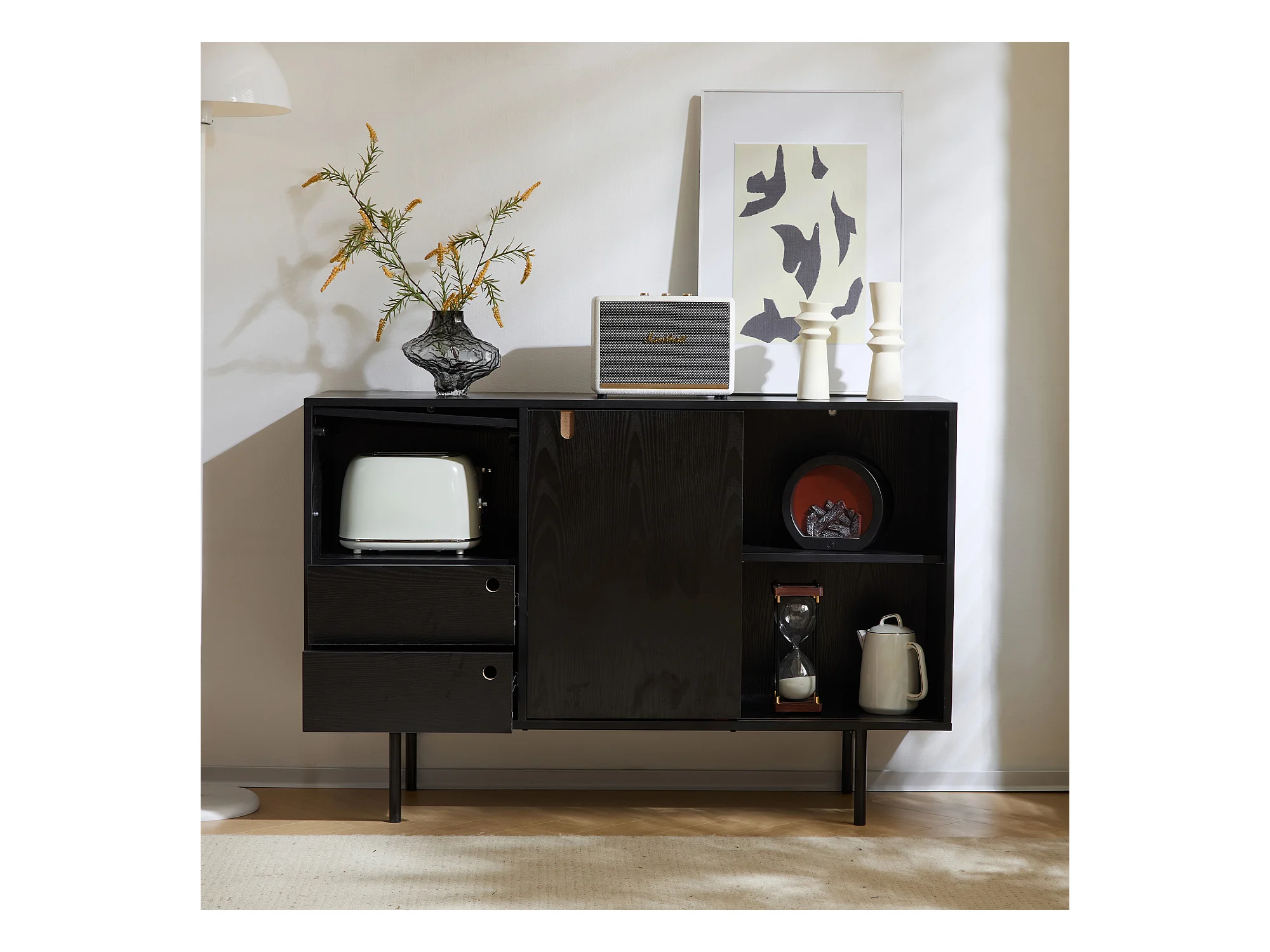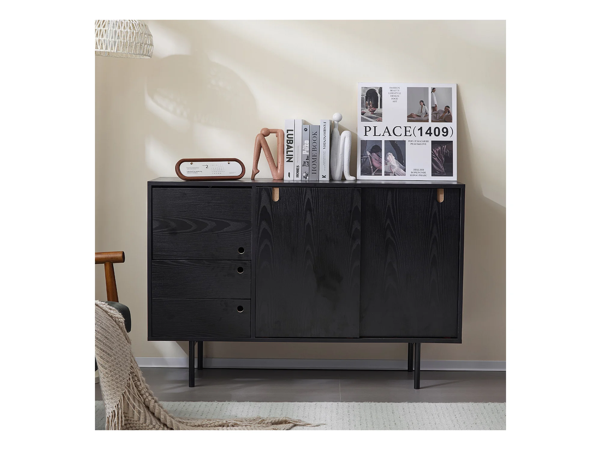 Aparador moderno con 2 cajones y 3 puertas - 120 x 35 x 78 cm - Tablero de partículas y metal - Negro