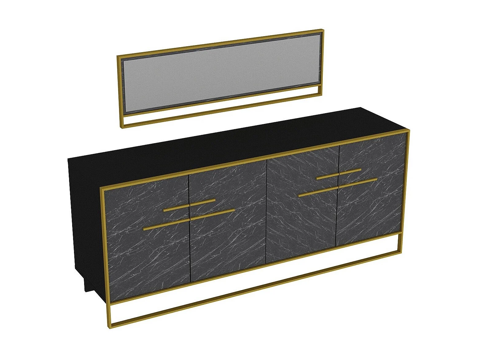 Aparador moderno con espejo, dorado y negro, 179,9 x 75 x 47,3 cm | 100 % melamina, 18 mm de grosor, para montar en la pared, diseño de mármol glamuro